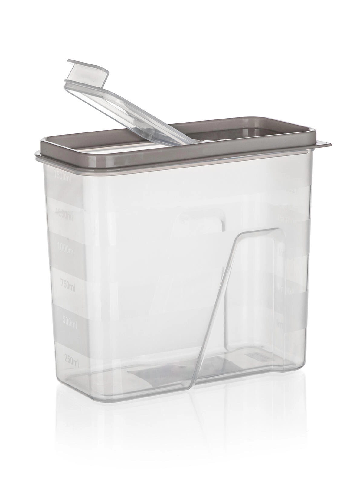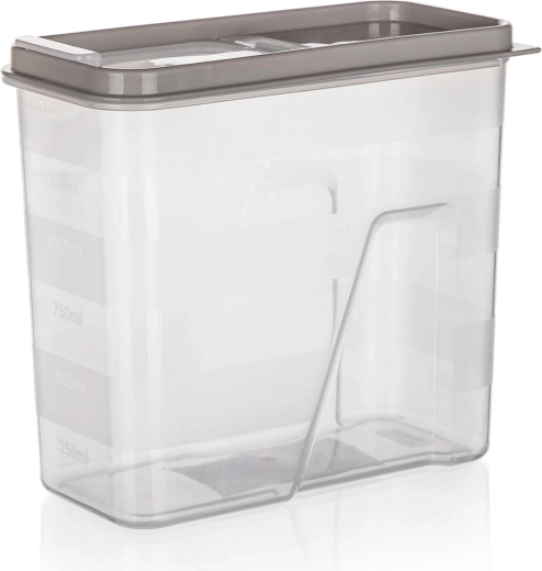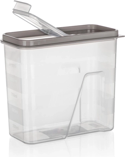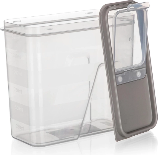 Doză transparentă practică, cu volum de 1,5 l și capac elegant în nuanța latte, pentru depozitarea clară și igienică a alimentelor. Datorită scării gradate integrate și capacului rabatabil inteligent, măsurați și turnați ușor făină, paste, leguminoase sau cereale. Închiderea etanșă ajută la menținerea prospețimii, iar pereții transparenți permit controlul instant al conținutului.