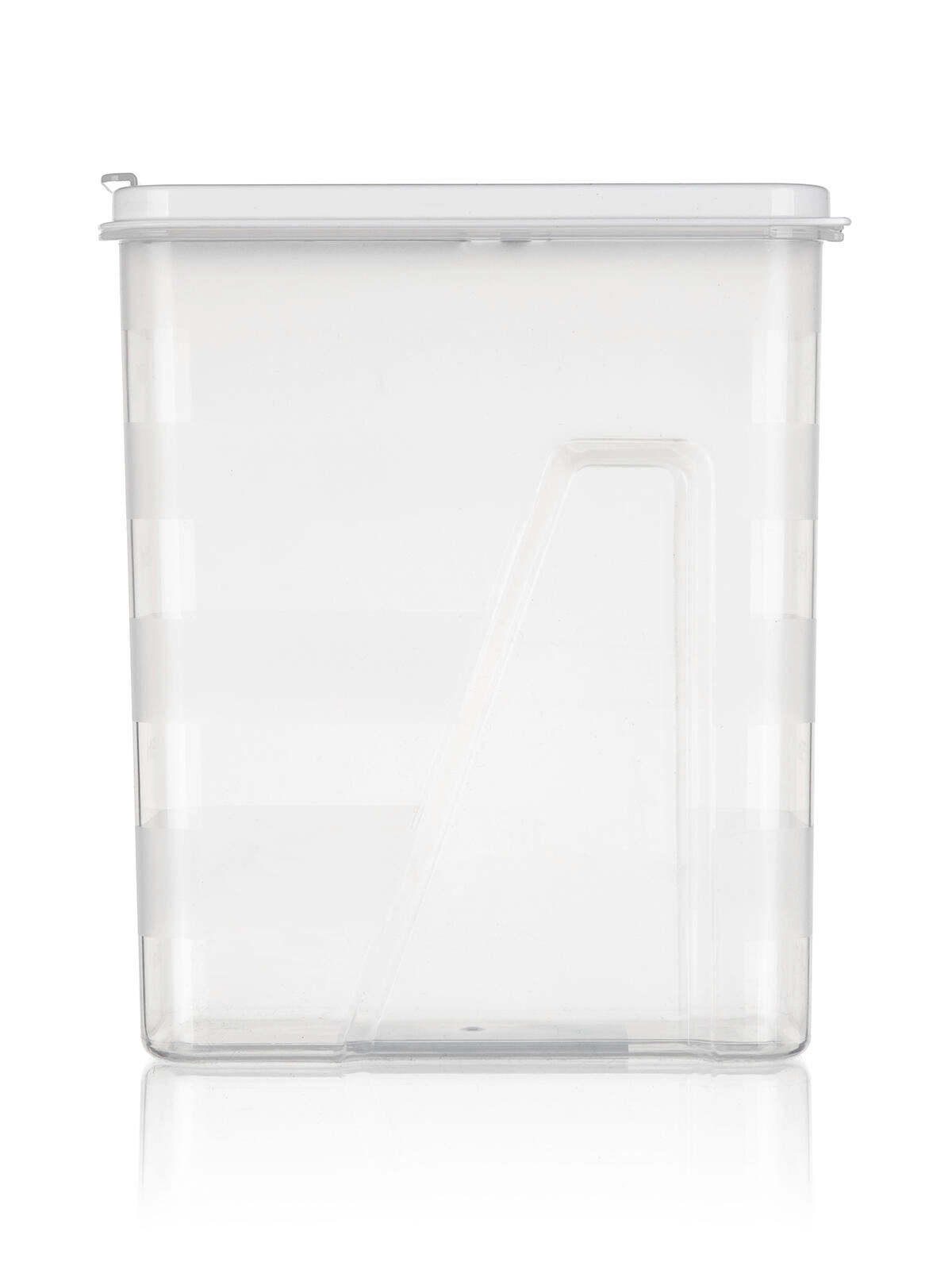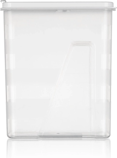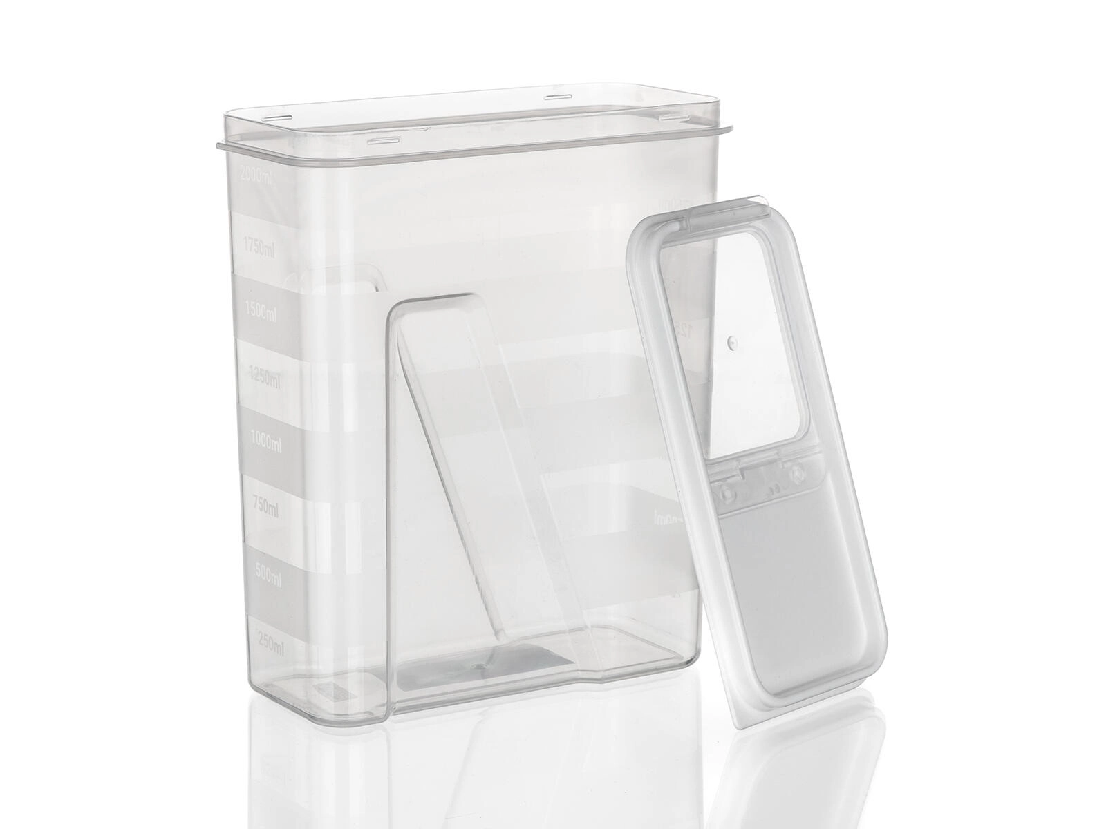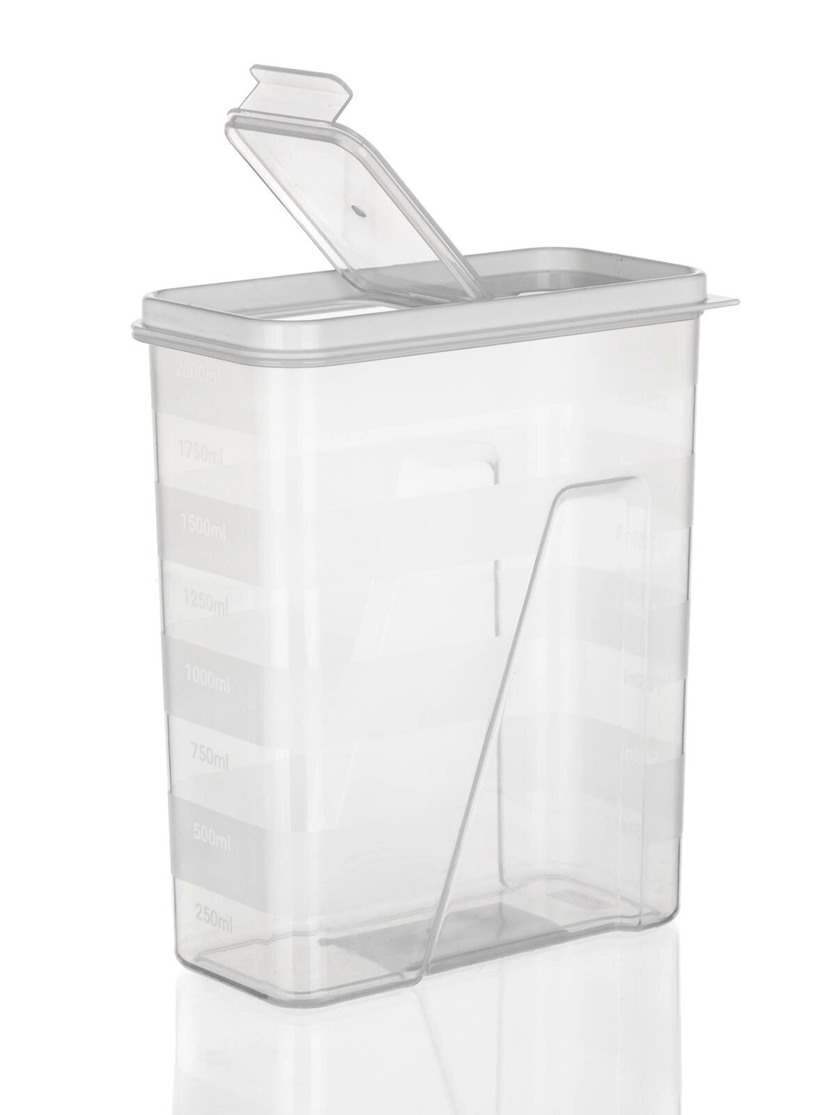 Acest recipient spațios de 2 litri este ideal pentru organizarea zilnică a cămării. Pereții transparenți oferă o verificare vizuală rapidă a conținutului, iar capacul alb cu deschidere practică asigură că alimentele rămân proaspete mai mult timp și protejate de umiditate.