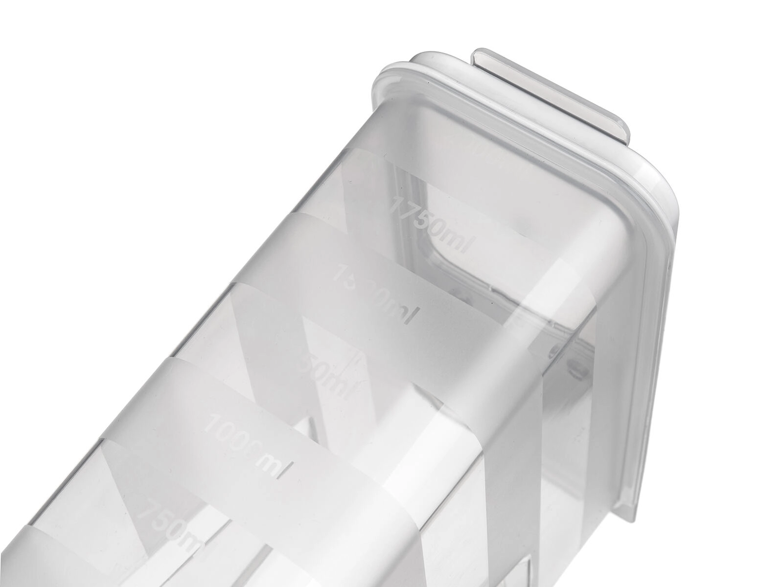 Gradațiile cu pas de 250 ml facilitează dozarea precisă și controlul stocurilor. Recipientul este potrivit pentru depozitarea pastelor, leguminoaselor, orezului, făinii, zahărului și a altor alimente vrac. Datorită formei dreptunghiulare compacte, încape bine pe rafturi și se combină ușor cu alți organizatori.