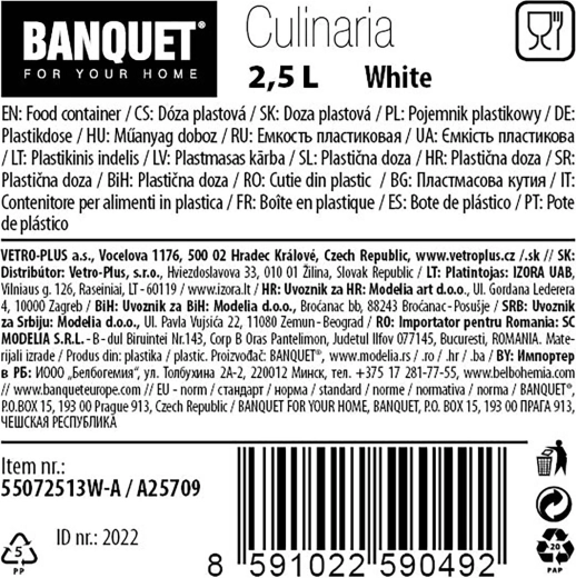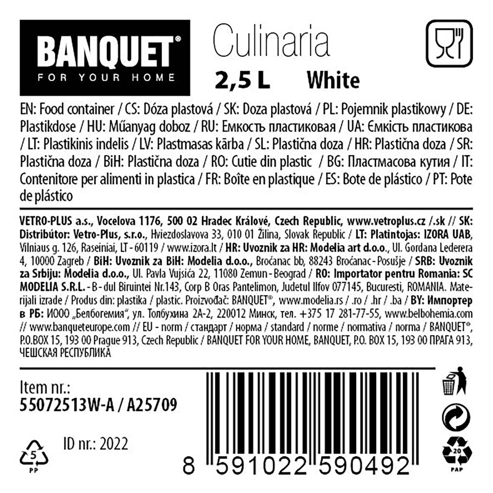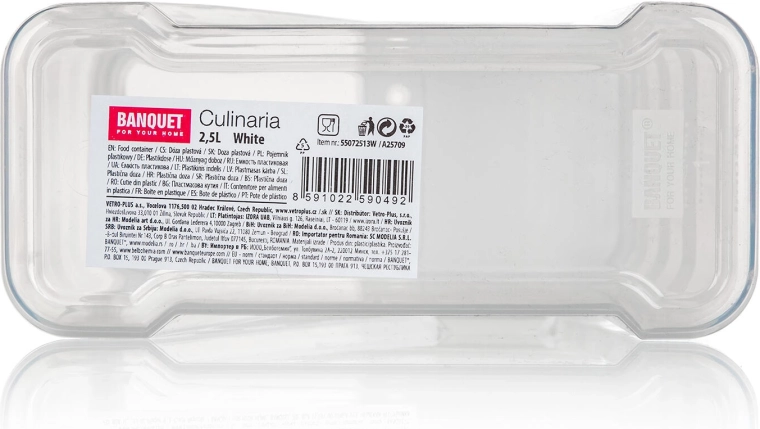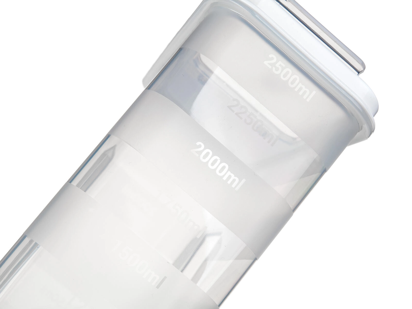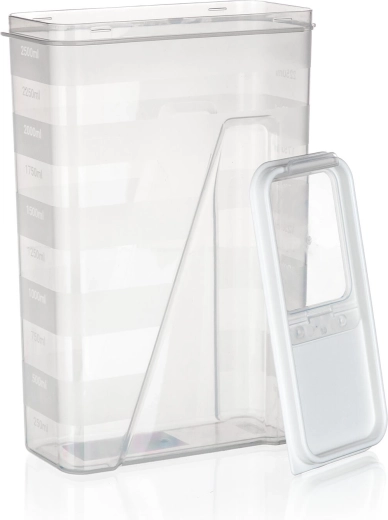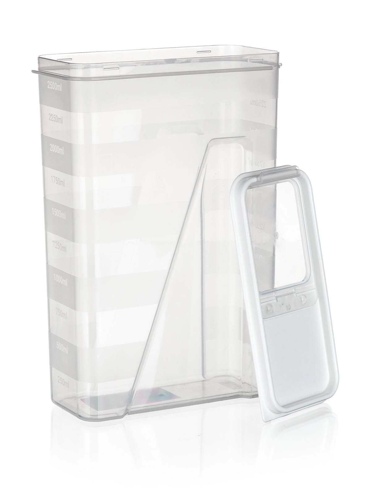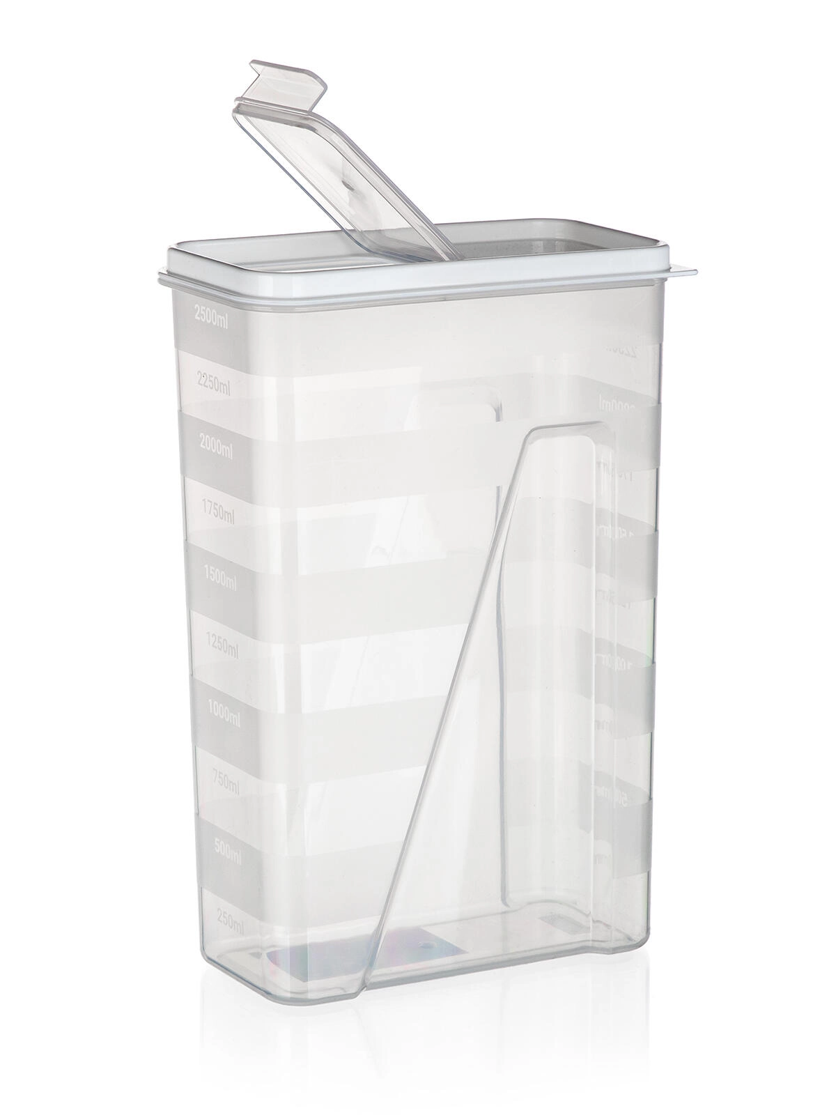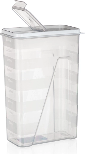Recipient de bucătărie practic, cu volum de 2,5 l, dotat cu capac dozator rabatabil pentru turnare ușoară și măsurare precisă. Corp transparent pentru control instant al conținutului și capac etanș de culoare albă, care ajută la menținerea alimentelor proaspete mai mult timp. Ideal pentru paste, leguminoase, făină, orez sau cereale, cu scară gradată din 250 în 250 ml pentru porționare comodă.