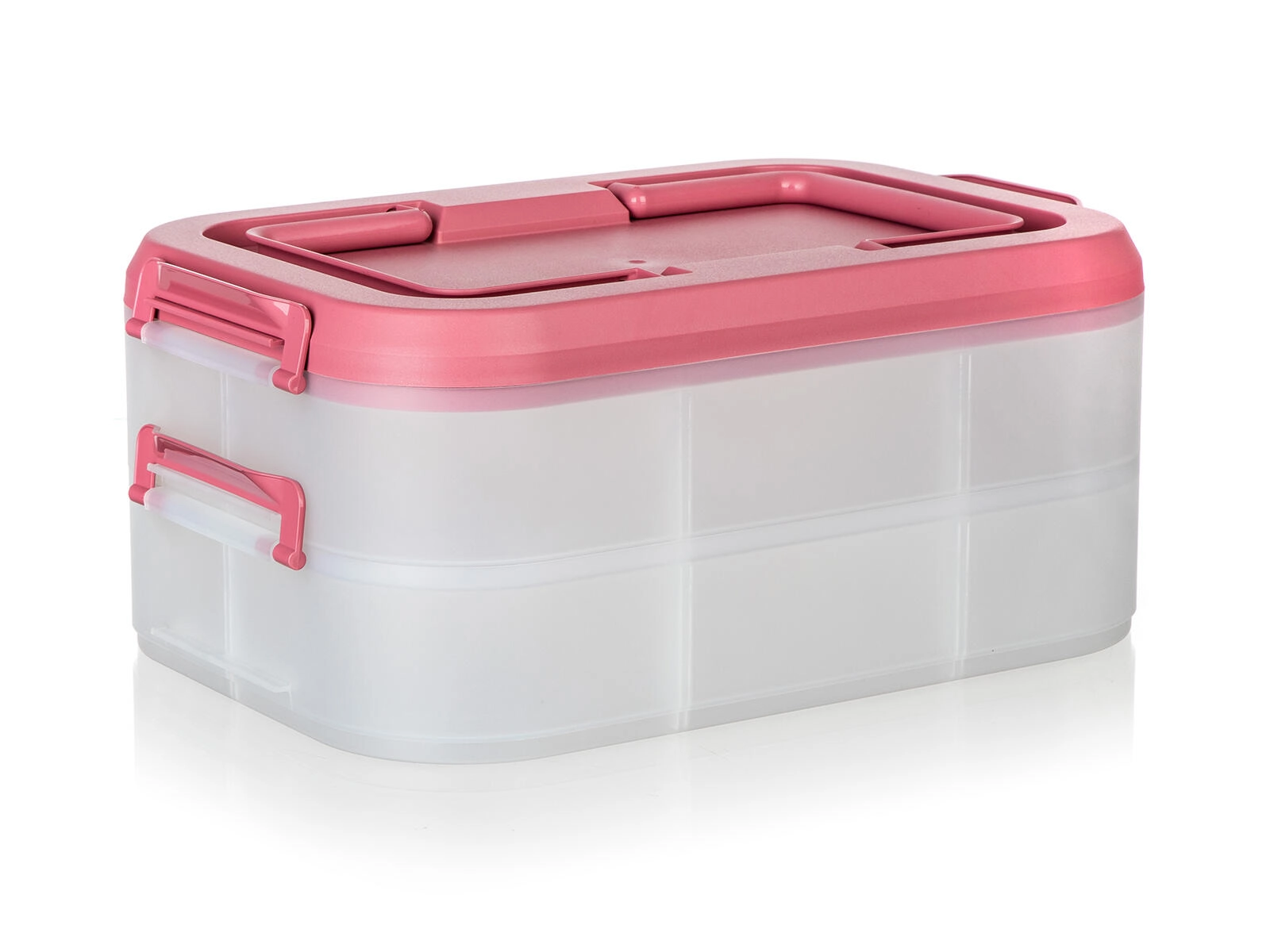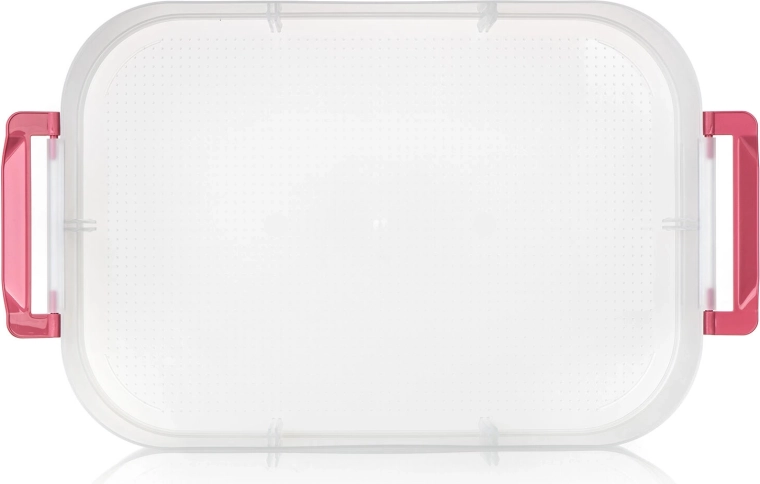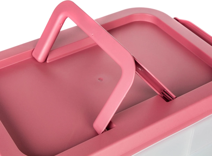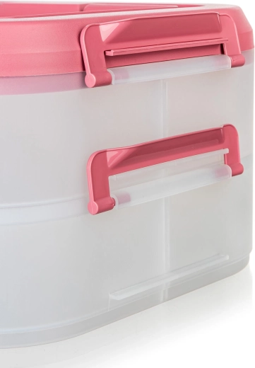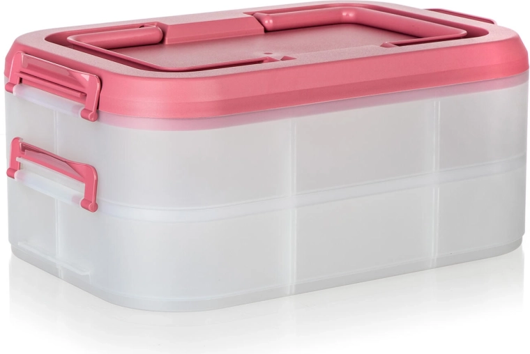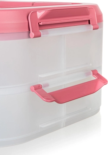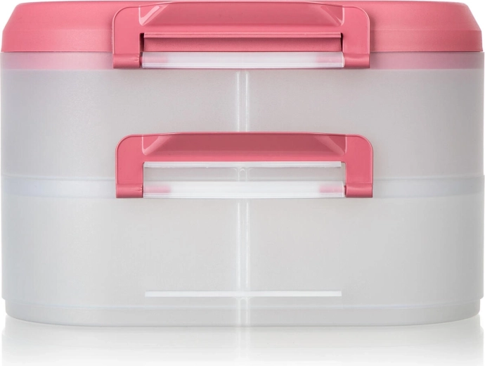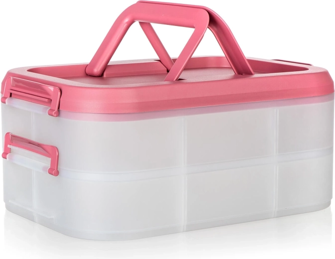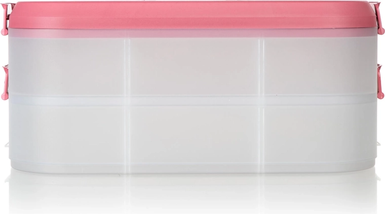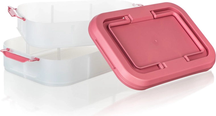 Cutia alimentară practică, pe două niveluri, cu mâner solid pentru transport facil, păstrează mâncarea în siguranță și organizată. Datorită cutiilor transparente vezi mereu conținutul, clemele robuste asigură o închidere etanșă, iar capacul roz cu mâner ușurează transportul la picnic, petreceri sau în călătorii.
