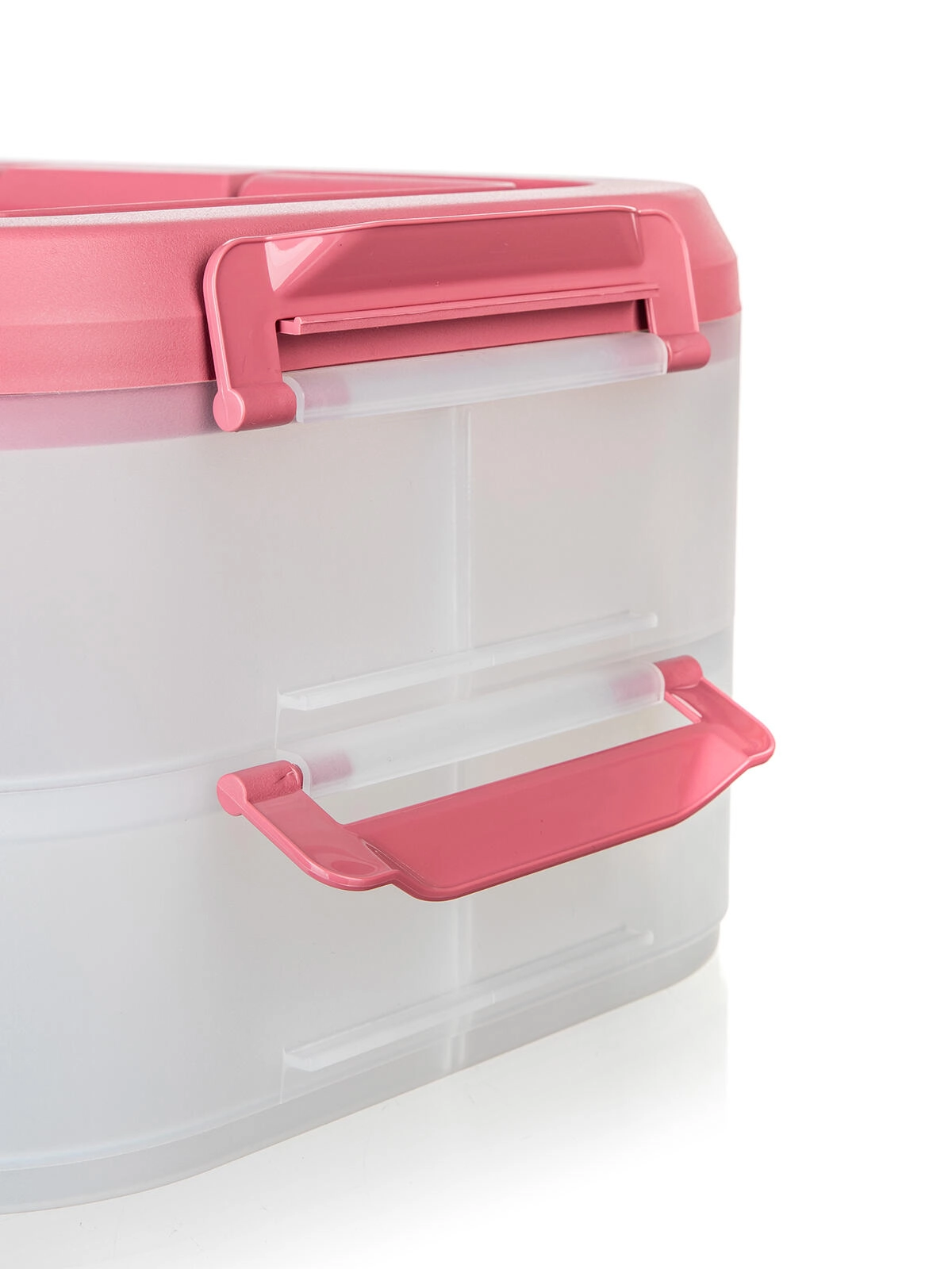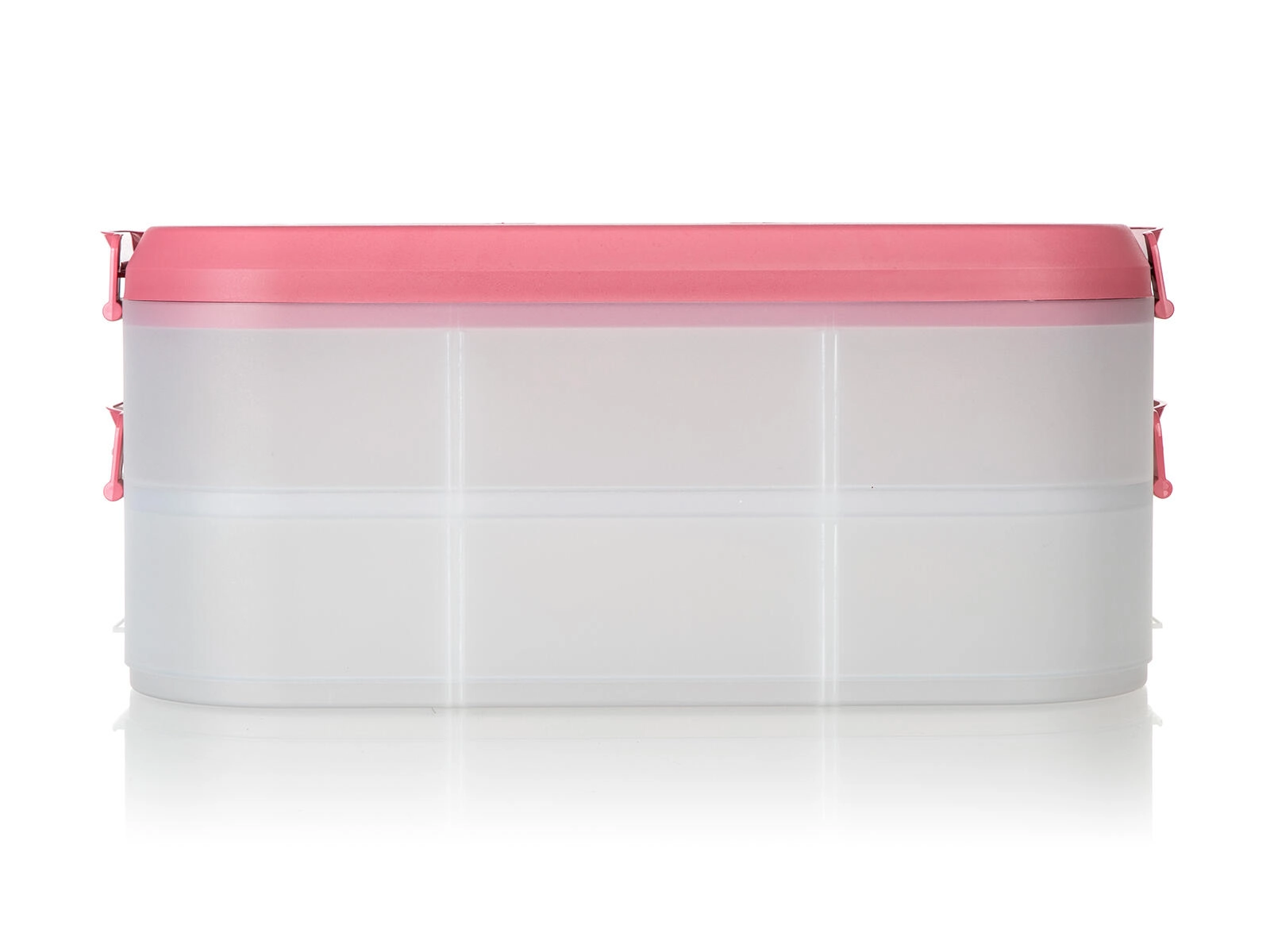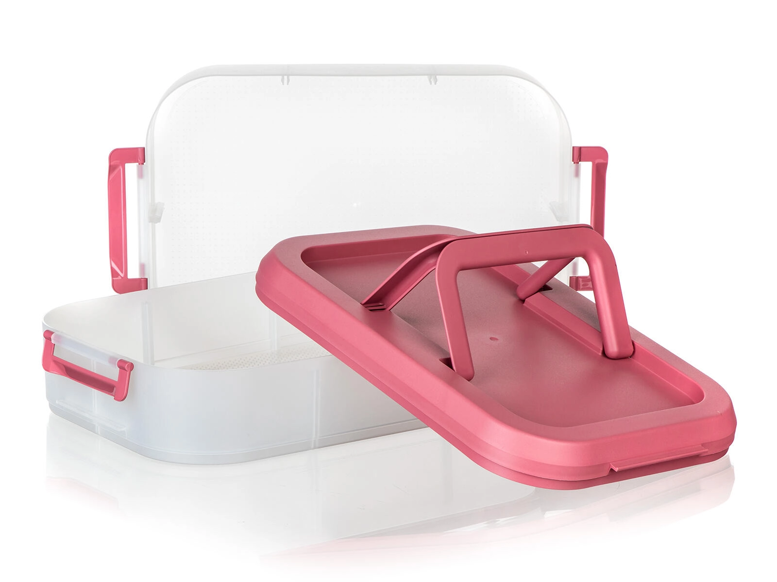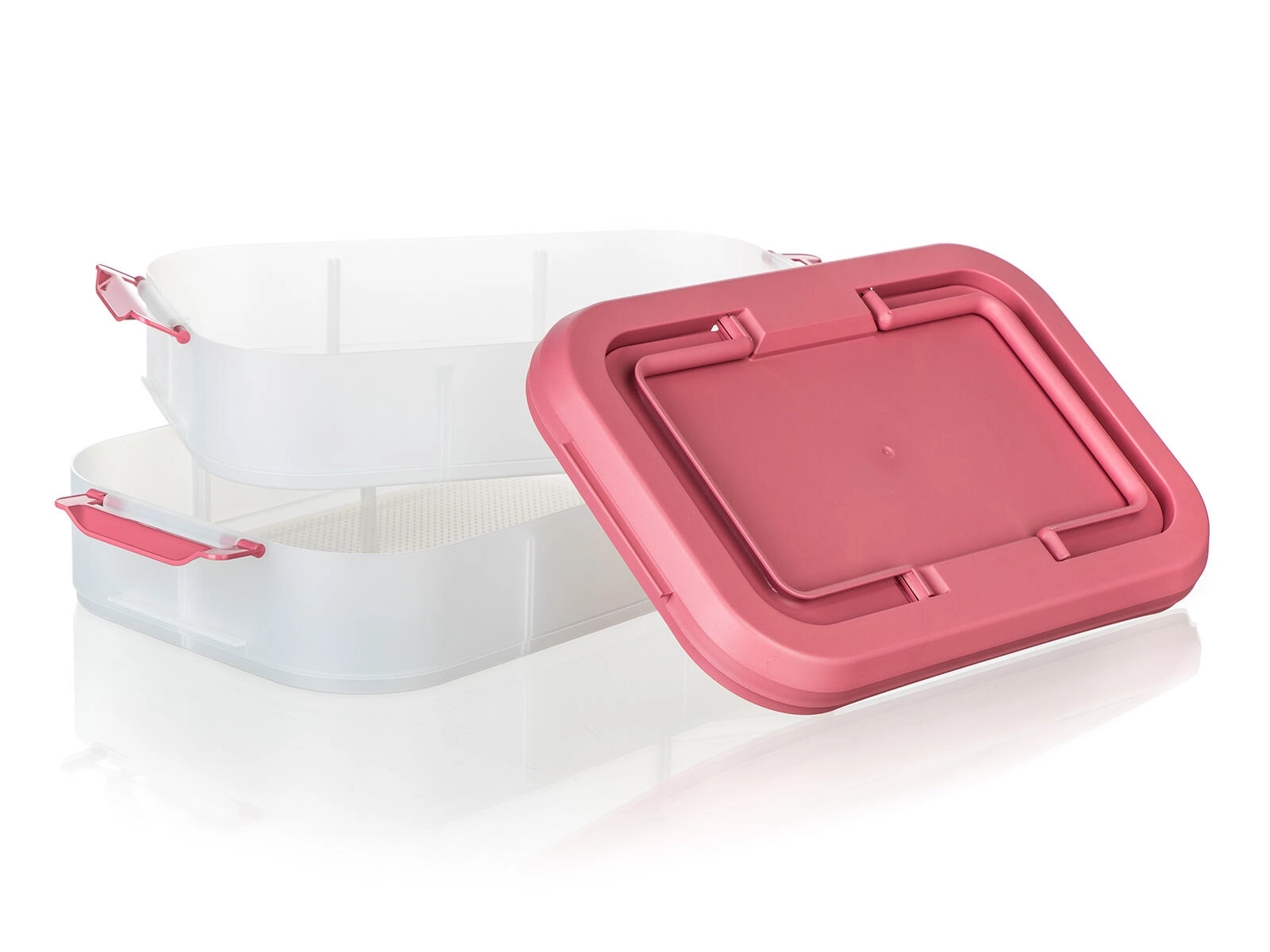 Cutia alimentară practică, pe două niveluri, cu mâner solid pentru transport facil, păstrează mâncarea în siguranță și organizată. Datorită cutiilor transparente vezi mereu conținutul, clemele robuste asigură o închidere etanșă, iar capacul roz cu mâner ușurează transportul la picnic, petreceri sau în călătorii.