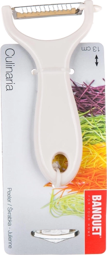 Răzuitoare practică tip Y pentru pregătirea rapidă a fâșiilor fine julienne din legume și fructe. Lama ascuțită din oțel inoxidabil de 5 cm taie precis și uniform, iar mânerul rezistent din plastic asigură o prindere confortabilă. Ideală pentru morcovi, țelină, ridichi și alte ingrediente, în mix de culori pentru bucătăria ta.
