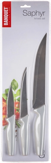 Setul practic de cuțite de bucătărie SAPHYR în variantă din 3 piese acoperă tăierea zilnică, felierea, porționarea și pregătirea cărnii. Lamele din oțel de calitate asigură o durată de viață îndelungată și o tăiere precisă și curată, în timp ce mânerele ergonomice gri oferă o prindere sigură și confortabilă.