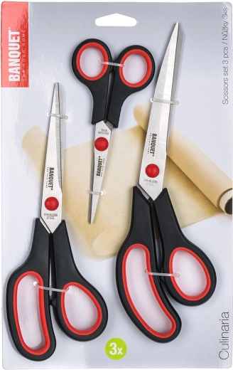 Set universal de foarfece pentru casă și birou, conține trei dimensiuni pentru utilizări diverse: 14, 21 și 24 cm. Lamele din oțel de calitate asigură durată lungă de viață, iar mânerele confortabile din plastic oferă priză sigură și comodă. Potrivite pentru hârtie, textile și lucrări casnice obișnuite.