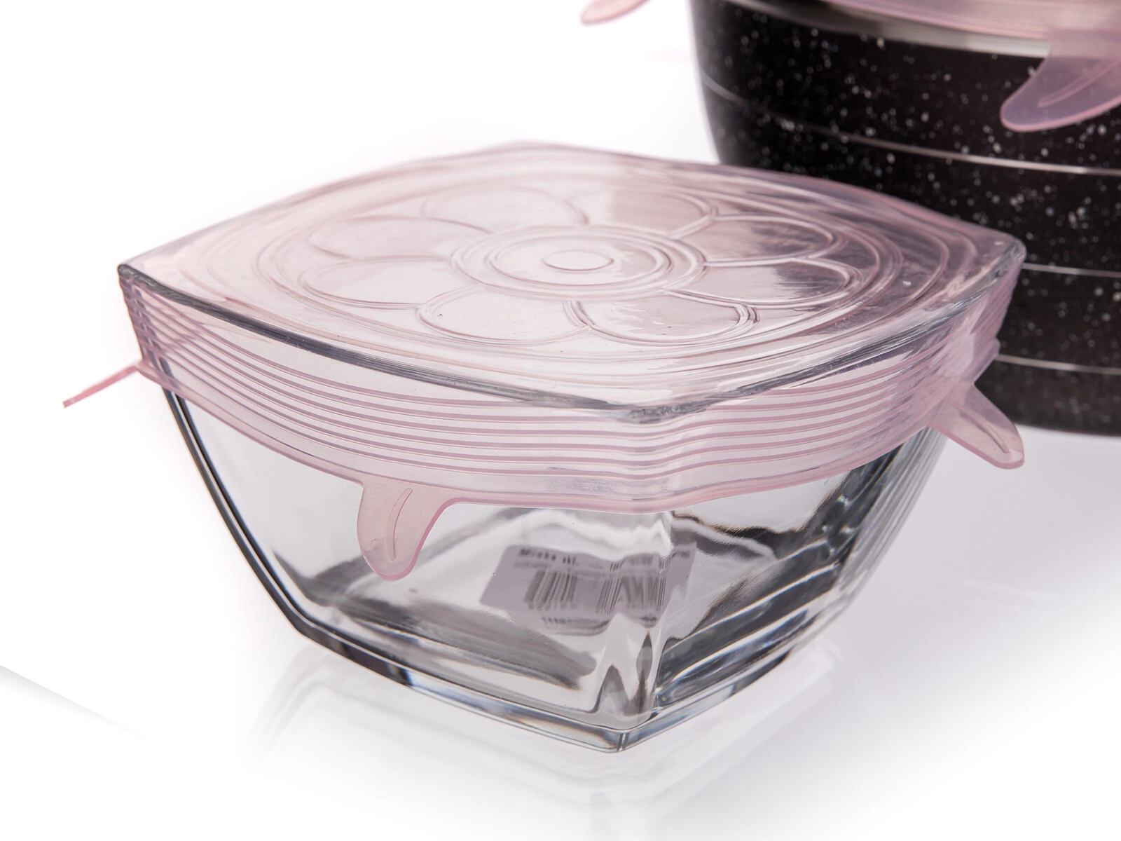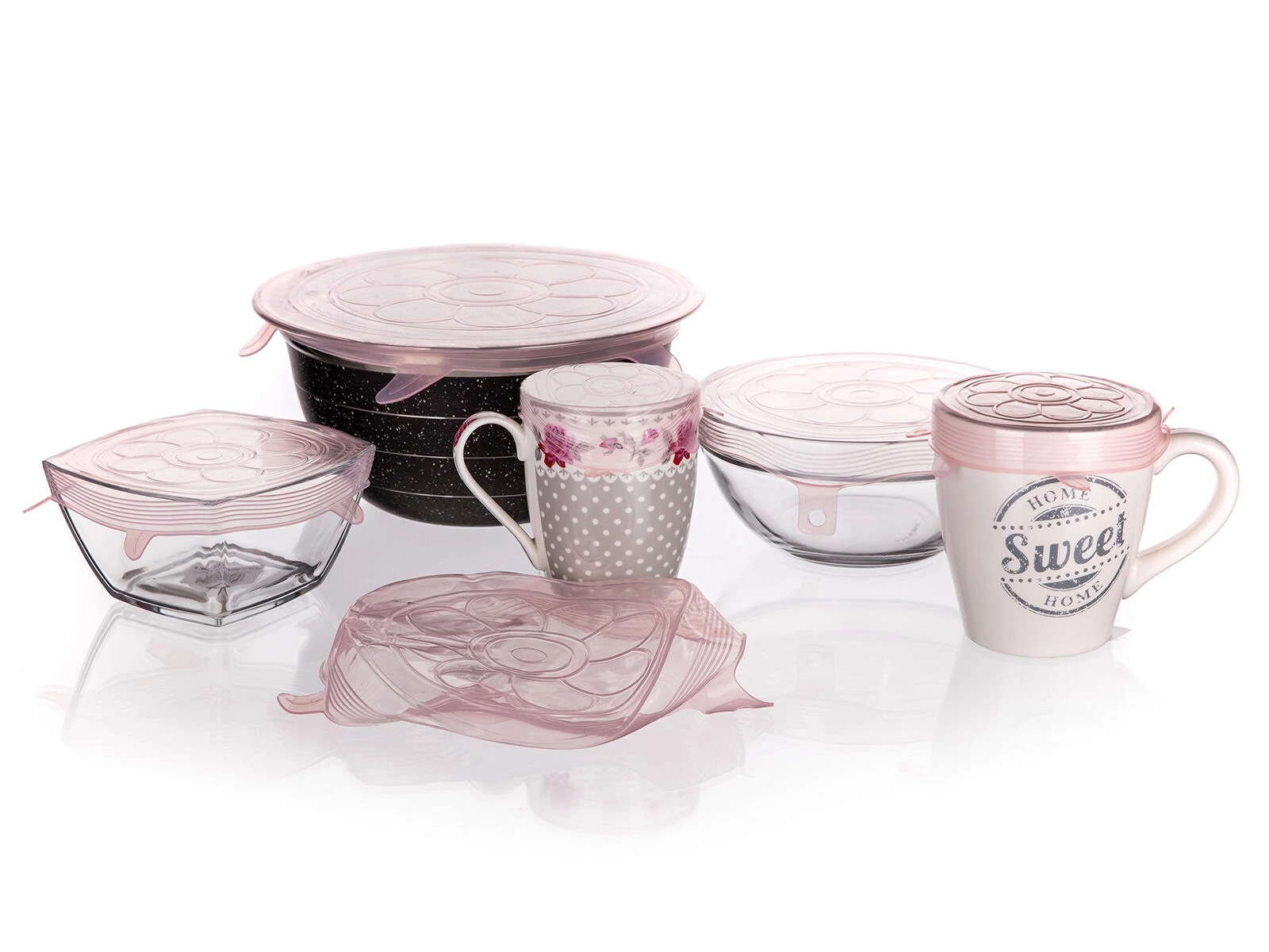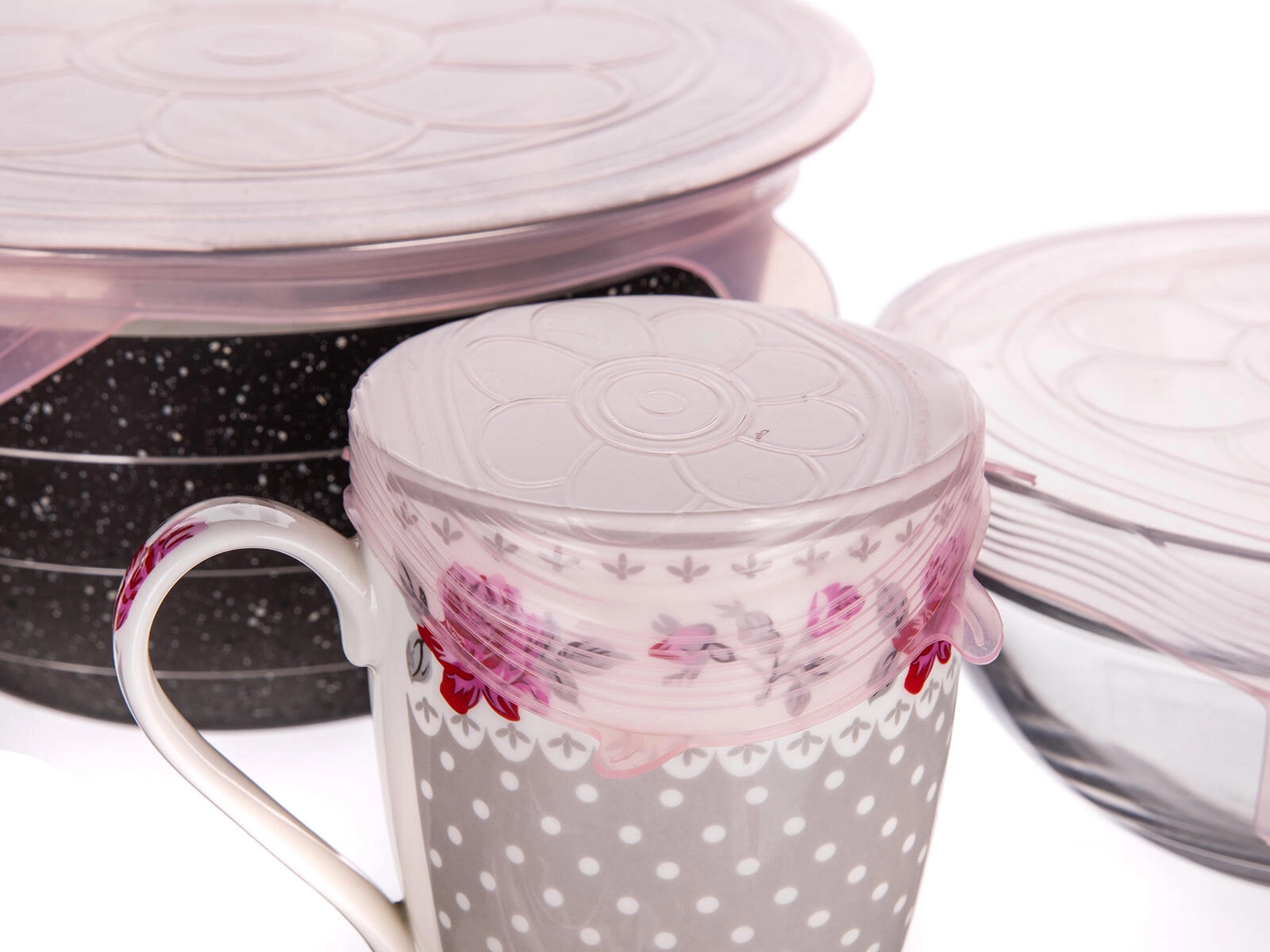 Șase dimensiuni acoperă căni, pahare, boluri și vase mari – capacele se întind ușor și aderă la forme diferite.