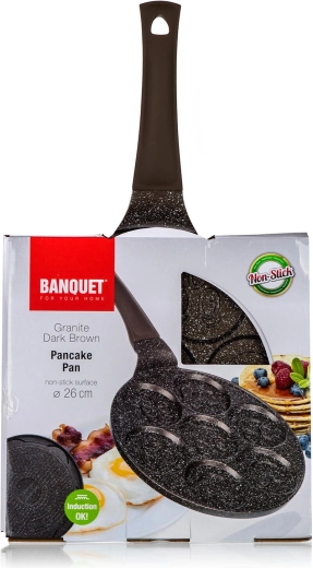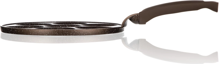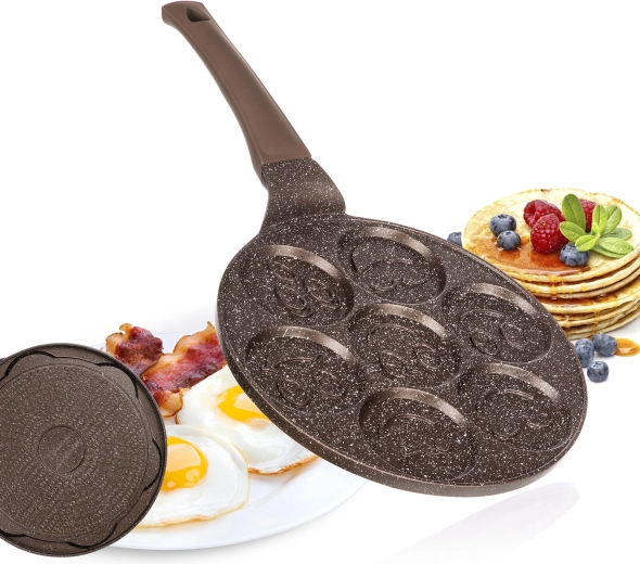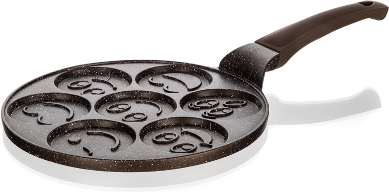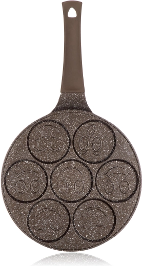 Această tigaie de calitate pentru clătite din aluminiu turnat cu suprafață antiaderentă dublu strat în design maro marmorat este ideală pentru prepararea rapidă și sănătoasă a clătitelor, dran- delor sau ouălor. Cele șapte forme rotunde cu relief smiley transformă fiecare dimineață într-o joacă și asigură porții rotunde uniforme.
