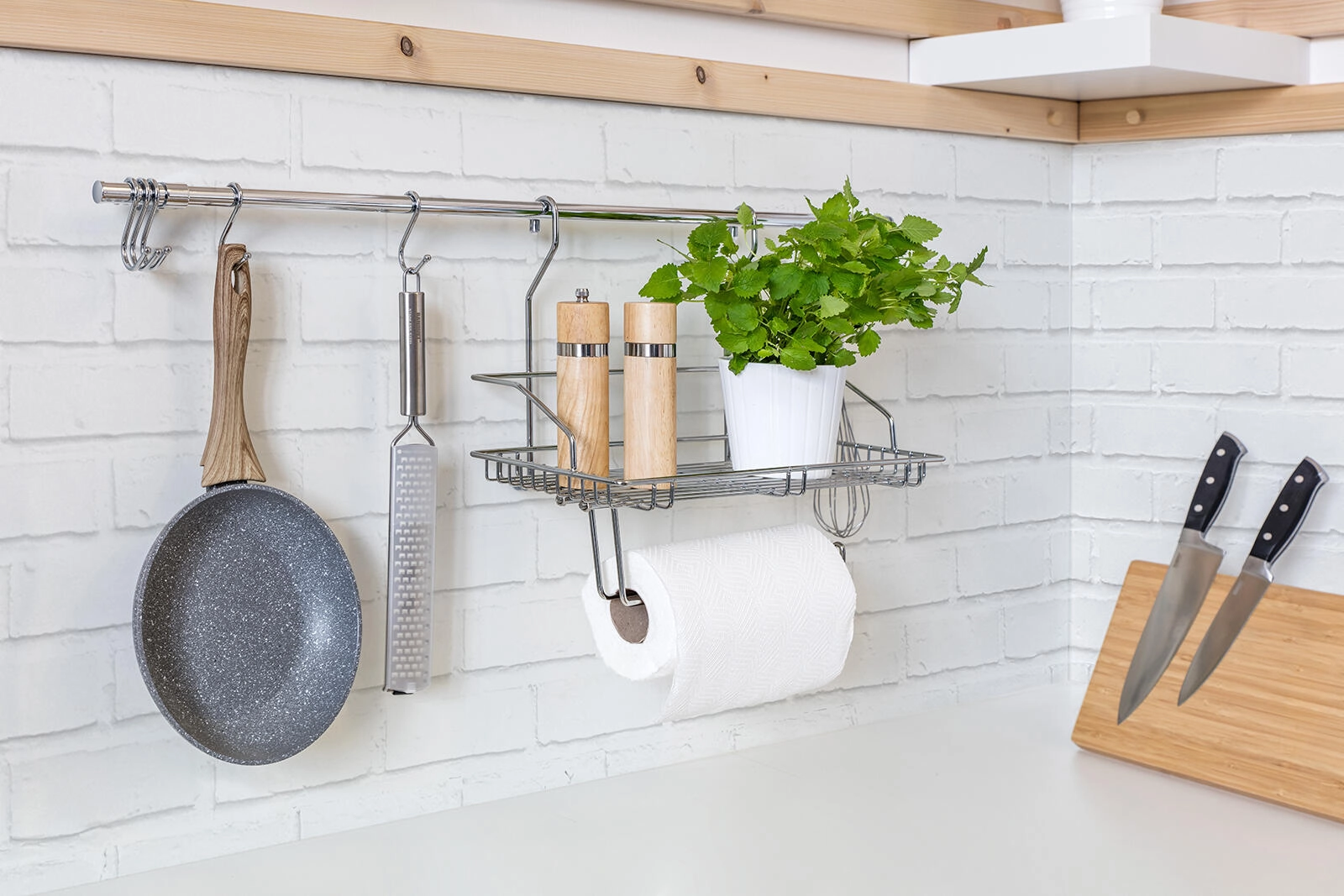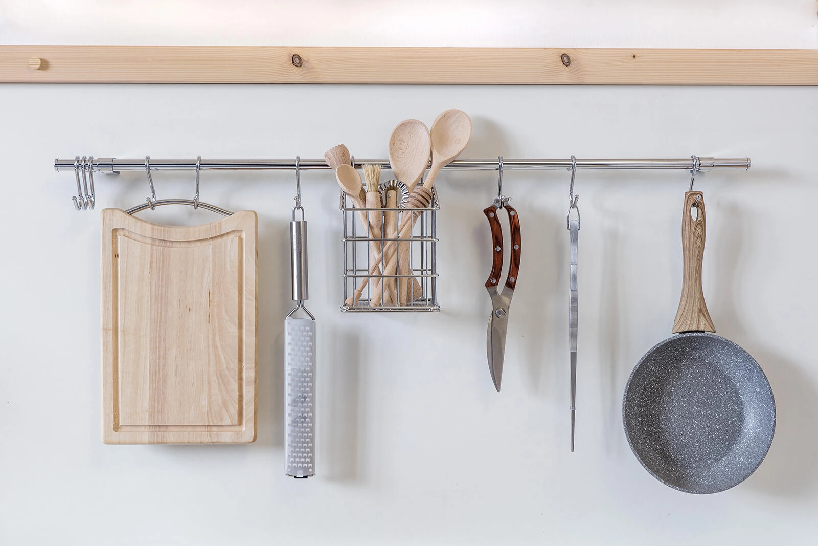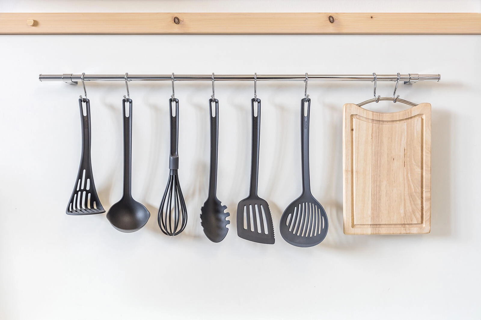 Agățați pe cârlige ustensilele cele mai folosite, tocătoarele sau tigăile și păstrați-le bine organizate și mereu accesibile.