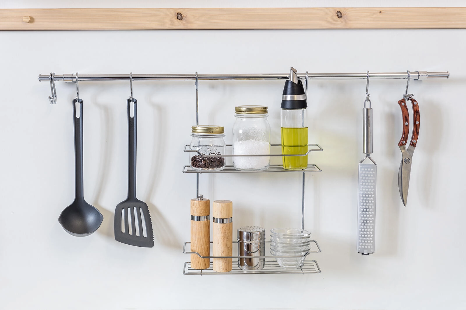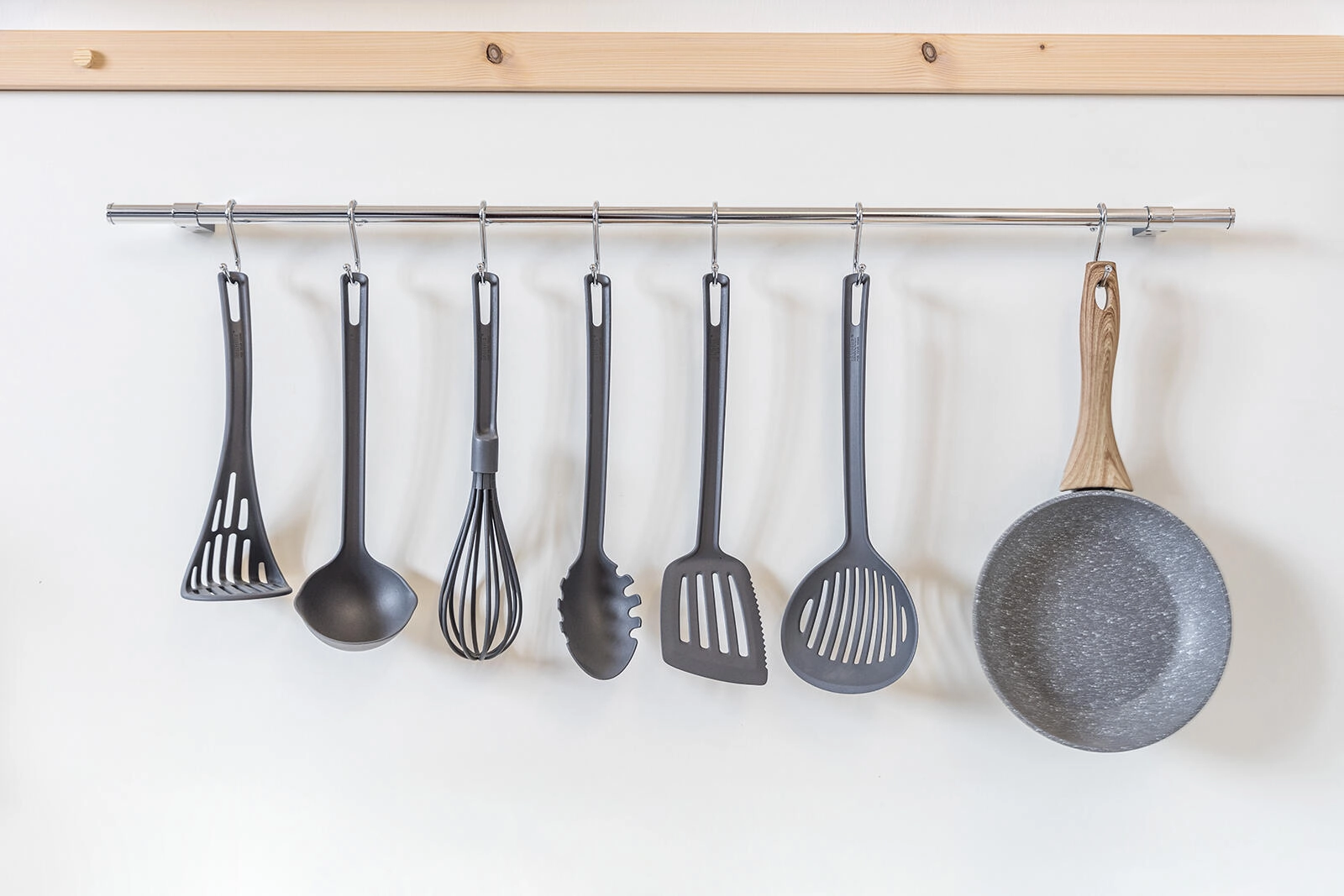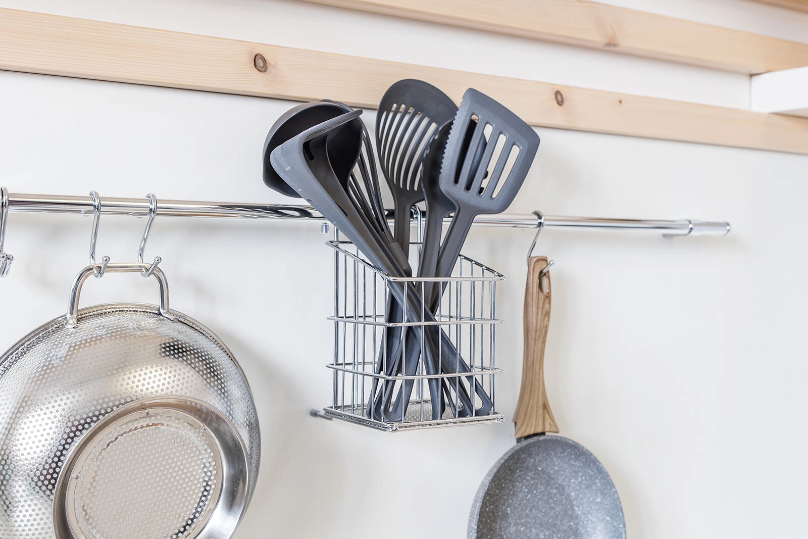 Atârnă polonice, teluri sau tigăi pe cârlige și economisește spațiu pe blatul de lucru.