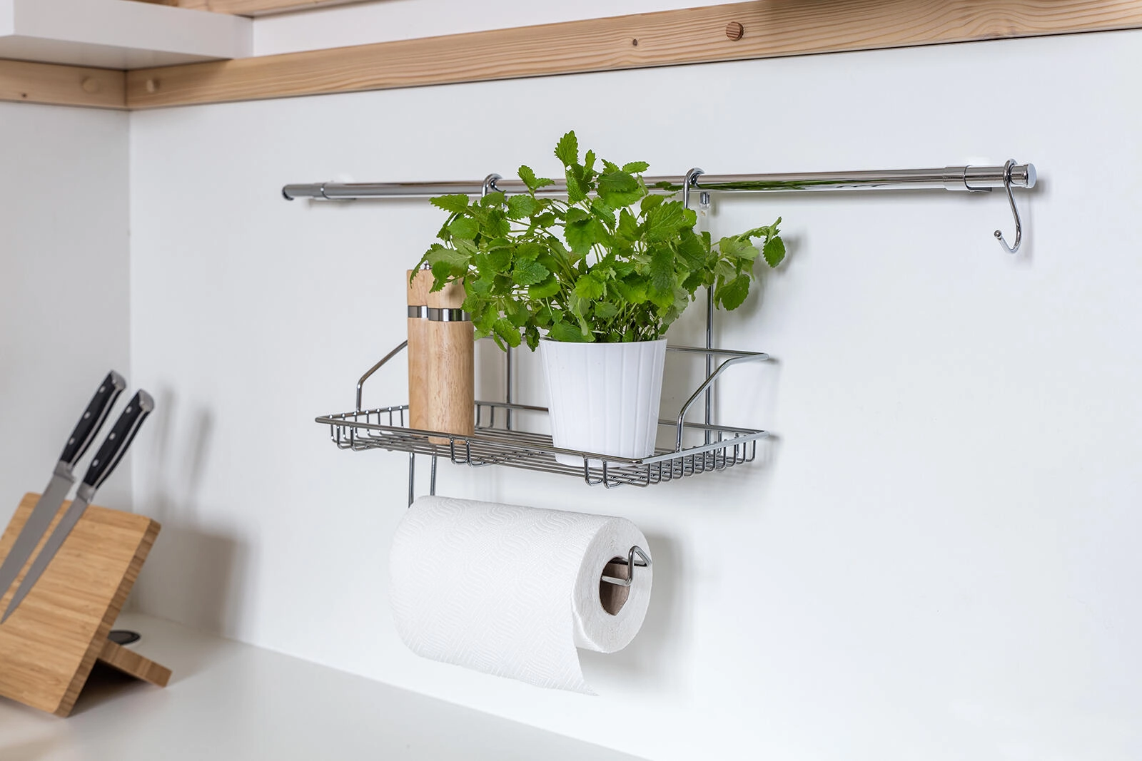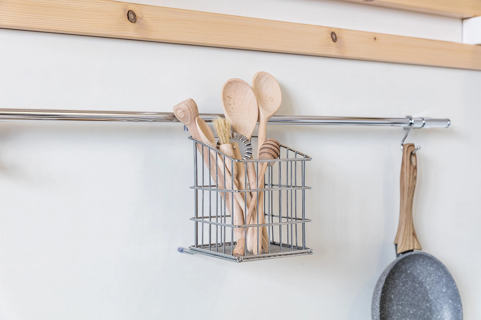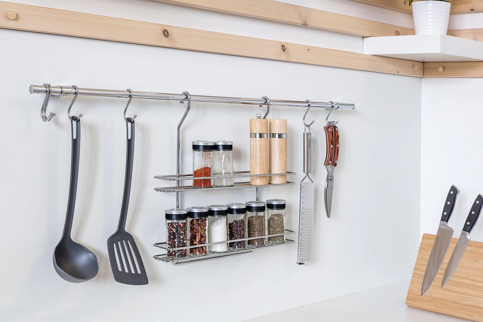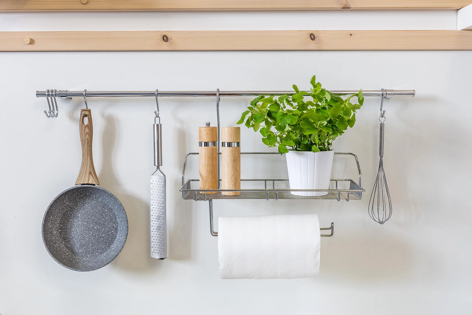 Atârnă polonice, teluri sau tigăi pe cârlige și economisește spațiu pe blatul de lucru.