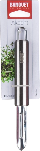 Practic, curățătorul dublu AKCENT din oțel inoxidabil de înaltă calitate, cu lungimea de 19 cm, ușurează pregătirea zilnică a ingredientelor. Oferă lamă dublă ascuțită și eficientă, întreținere ușoară și posibilitatea de spălare în mașina de spălat vase. Datorită ochiului pentru agățare, îl veți avea mereu la îndemână atât în bucătăria profesională, cât și acasă.
