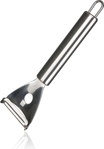 Practic curățător de bucătărie tip Y AKCENT, cu lamă transversală din oțel inoxidabil, face față cu ușurință curățării morcovilor, castraveților, hreanului și fructelor. Oferă lamă ascuțită de 5 cm, construcție durabilă din inox, utilizare confortabilă și posibilitatea de spălare în mașina de spălat vase. Datorită ochiului pentru agățare, îl vei avea mereu la îndemână.