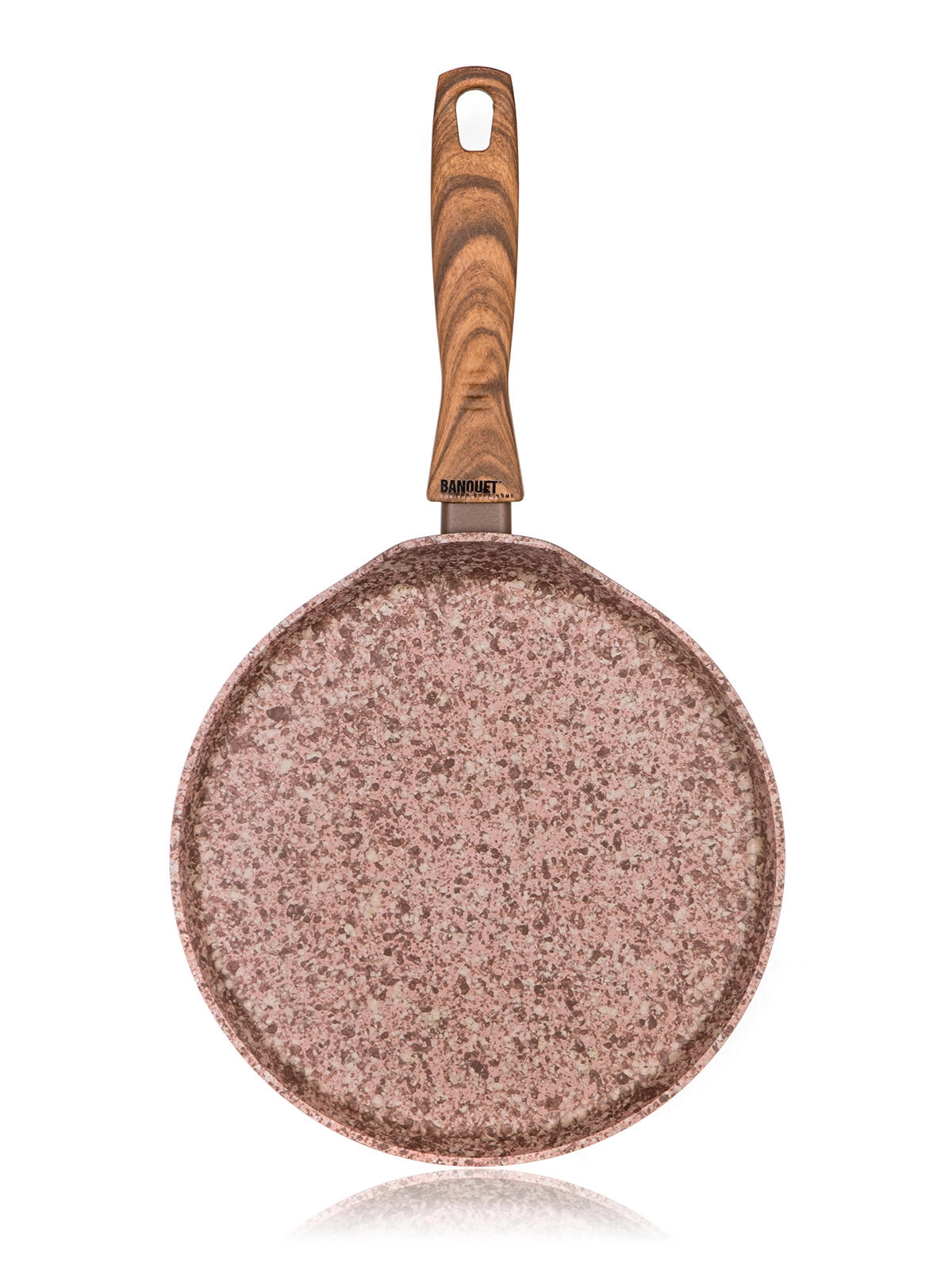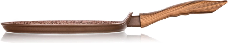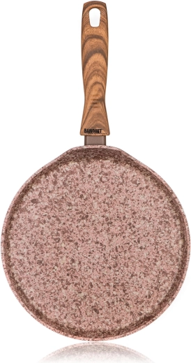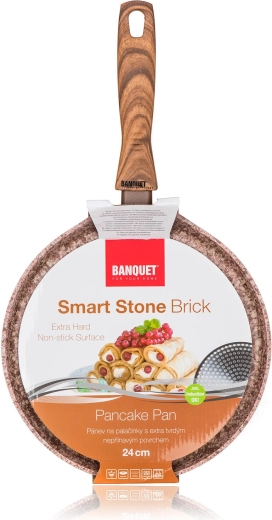 Tigaia pentru clătite Smart Stone Brick, cu diametrul de 24 cm, este fabricată din aluminiu forjat pentru distribuție rapidă și uniformă a căldurii. Stratul antiaderent dublu, cu textură de piatră de râu, asigură dezmoldare ușoară a preparatelor și curățare simplă. Decorul elegant de cărămidă, cu efect de marmură, este completat de mânerul ergonomic din bakelită cu finisaj soft touch în design de lemn natural.