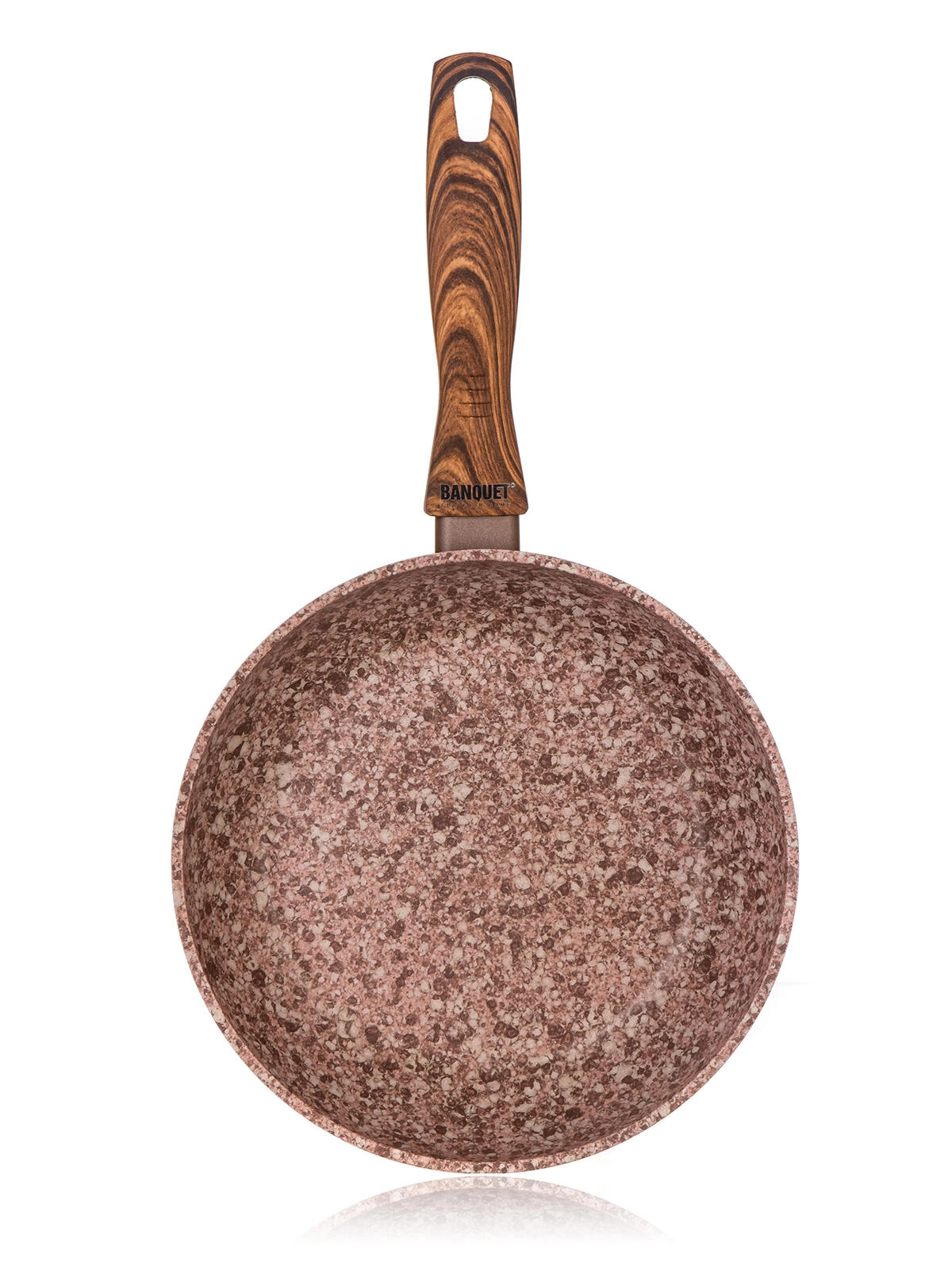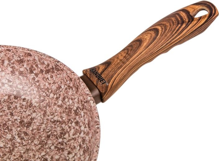Mânerul din bachelită cu decor de lemn este plăcut la atingere, oferă prindere sigură și ușurează manipularea la gătit.