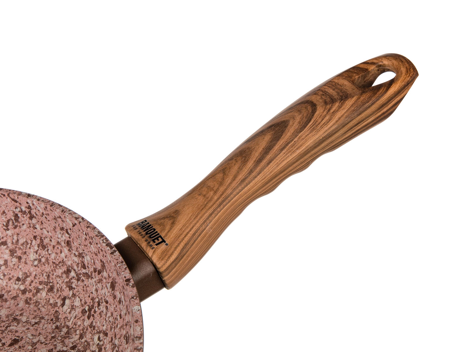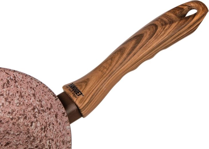 Mânerul din bachelită cu imitație de lemn și suprafață antiderapantă este plăcut la atingere și rămâne rece.