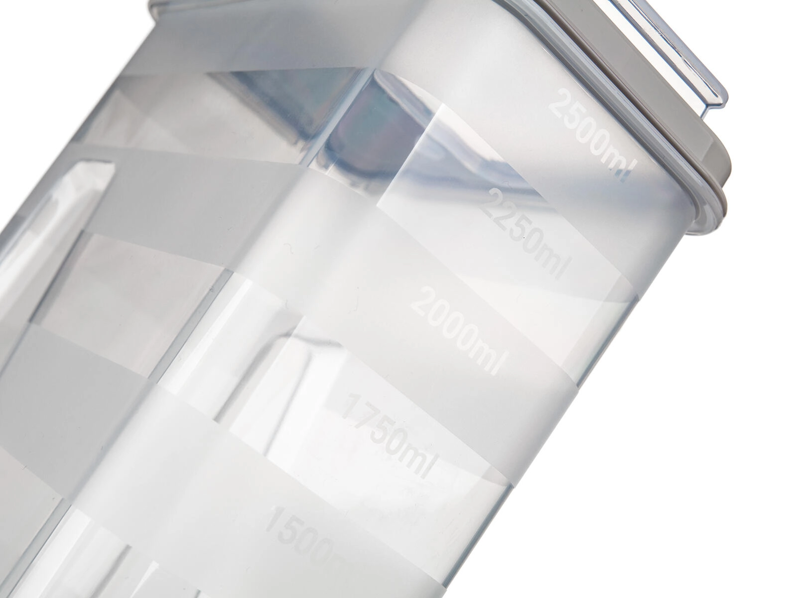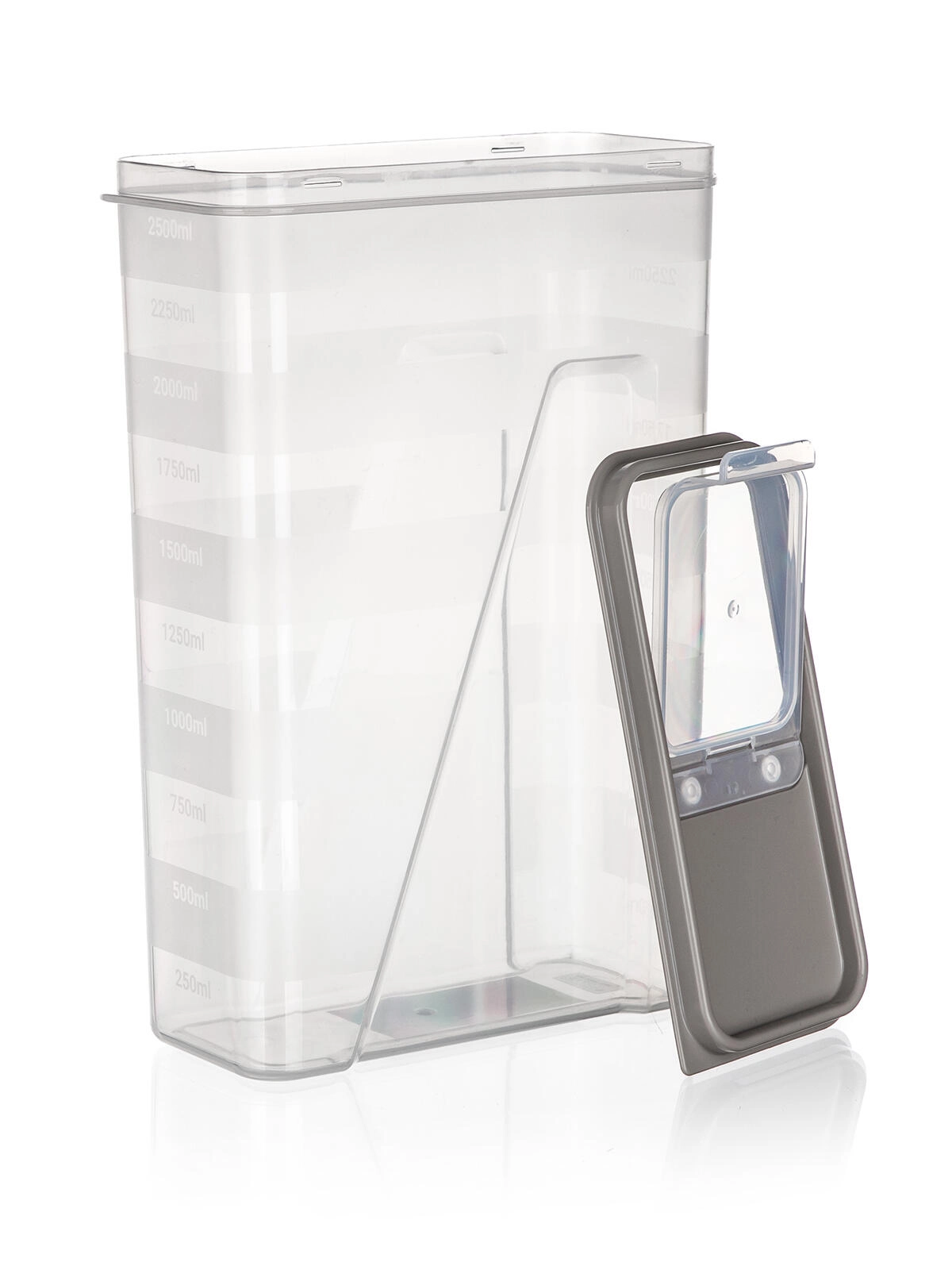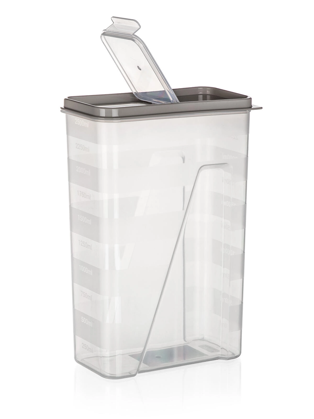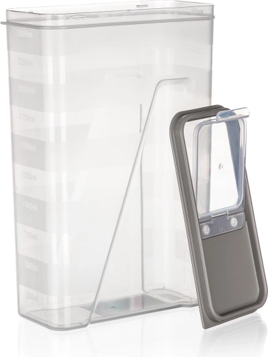 Cutia practică și elegantă, cu volum de 2,5 l, păstrează ingredientele uscate proaspete și organizate. Datorită corpului transparent vezi mereu conținutul și cantitatea, iar capacul în nuanța latte se deschide ușor și permite dozare precisă. Marcajele integrate la fiecare 250 ml facilitează controlul stocurilor și al rețetelor. Ideală pentru paste, leguminoase, făină, zahăr sau cereale.
