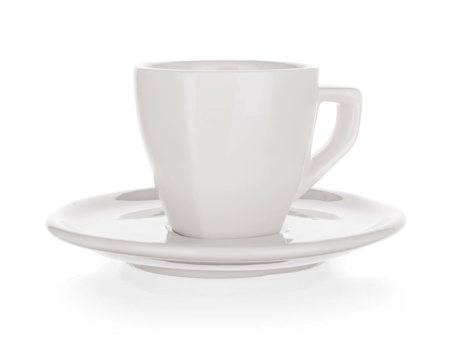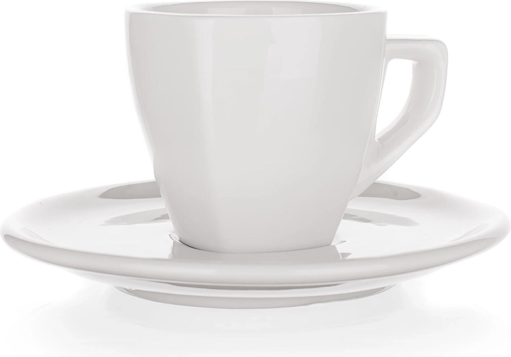 Ceașcă din porțelan cu farfurioară ALBA, volum 60 ml, cu design pătrat modern, ideală pentru espresso. Glazura albă de înaltă calitate asigură rezistență și întreținere ușoară. Potrivită pentru mașina de spălat vase și pentru utilizare în horeca.