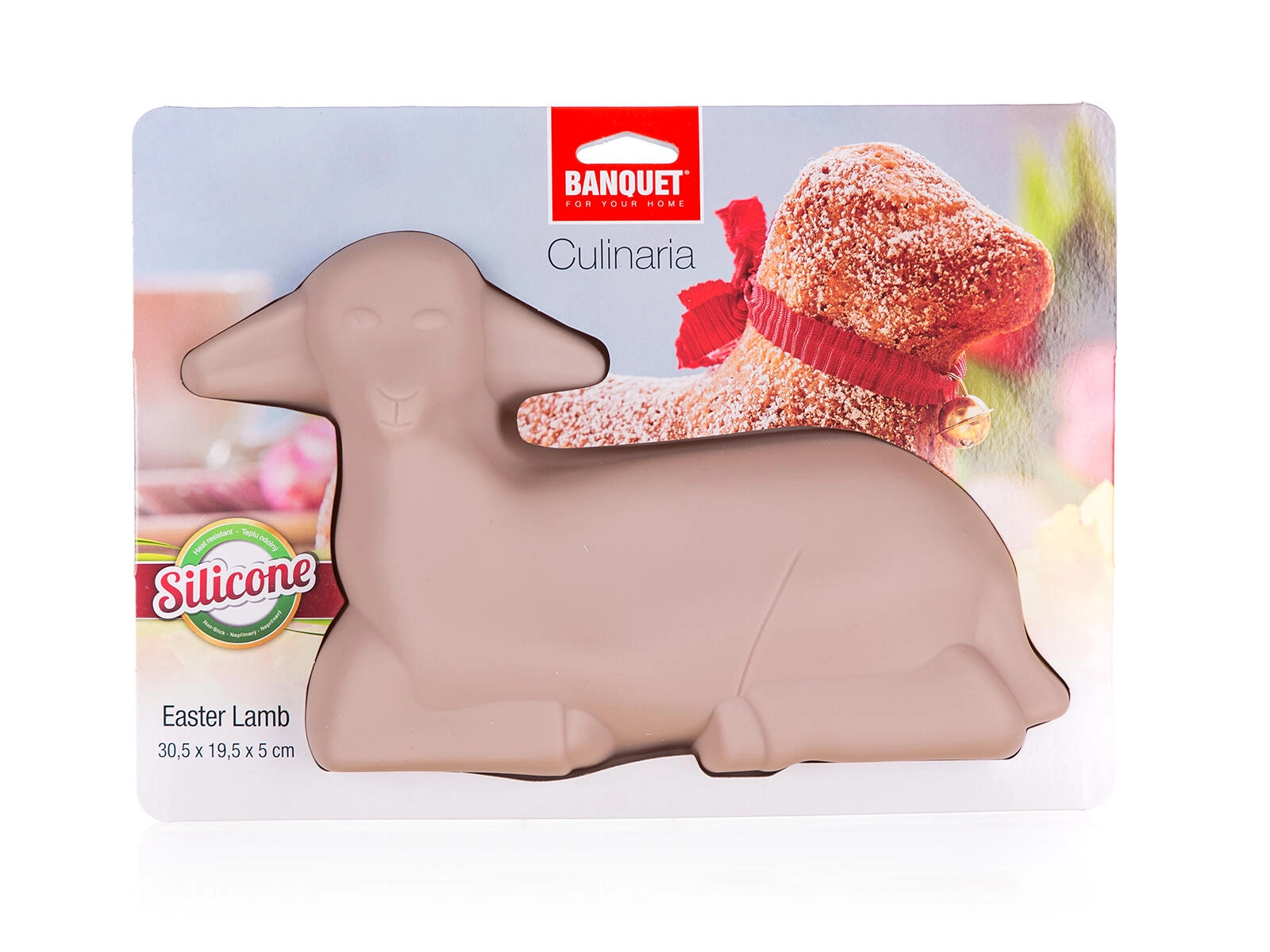 Formă practică din silicon pentru mielul de Paște, cu dimensiuni de 30,5 × 19,5 × 5 cm, din colecția Culinaria. Datorită siliconului antiaderent, coacerea este ușoară, fără lipire și cu o răsturnare simplă. Forma este rezistentă la temperaturi de până la 230 °C, nu absoarbe mirosuri sau arome și poate fi spălată în mașina de spălat vase.