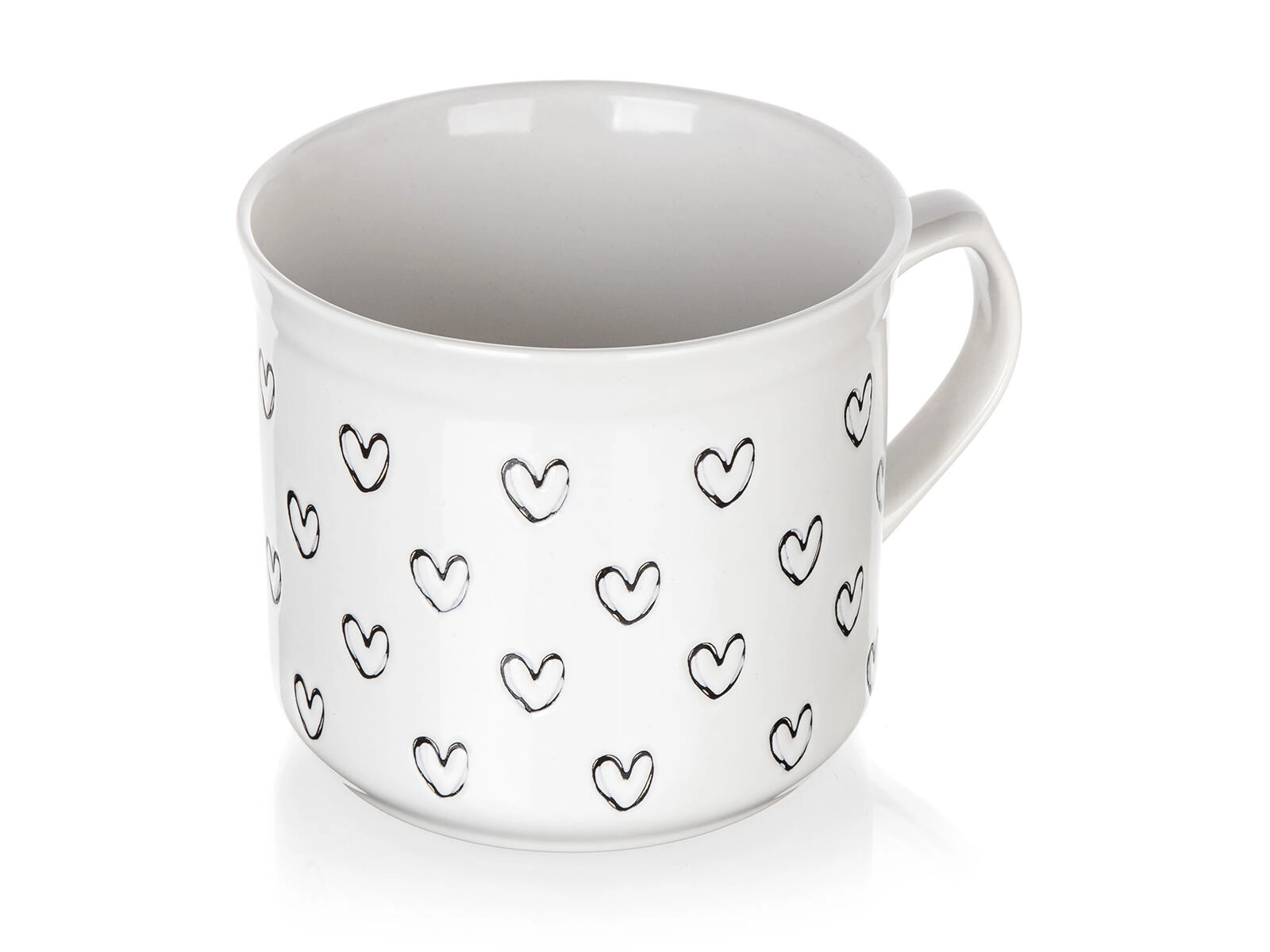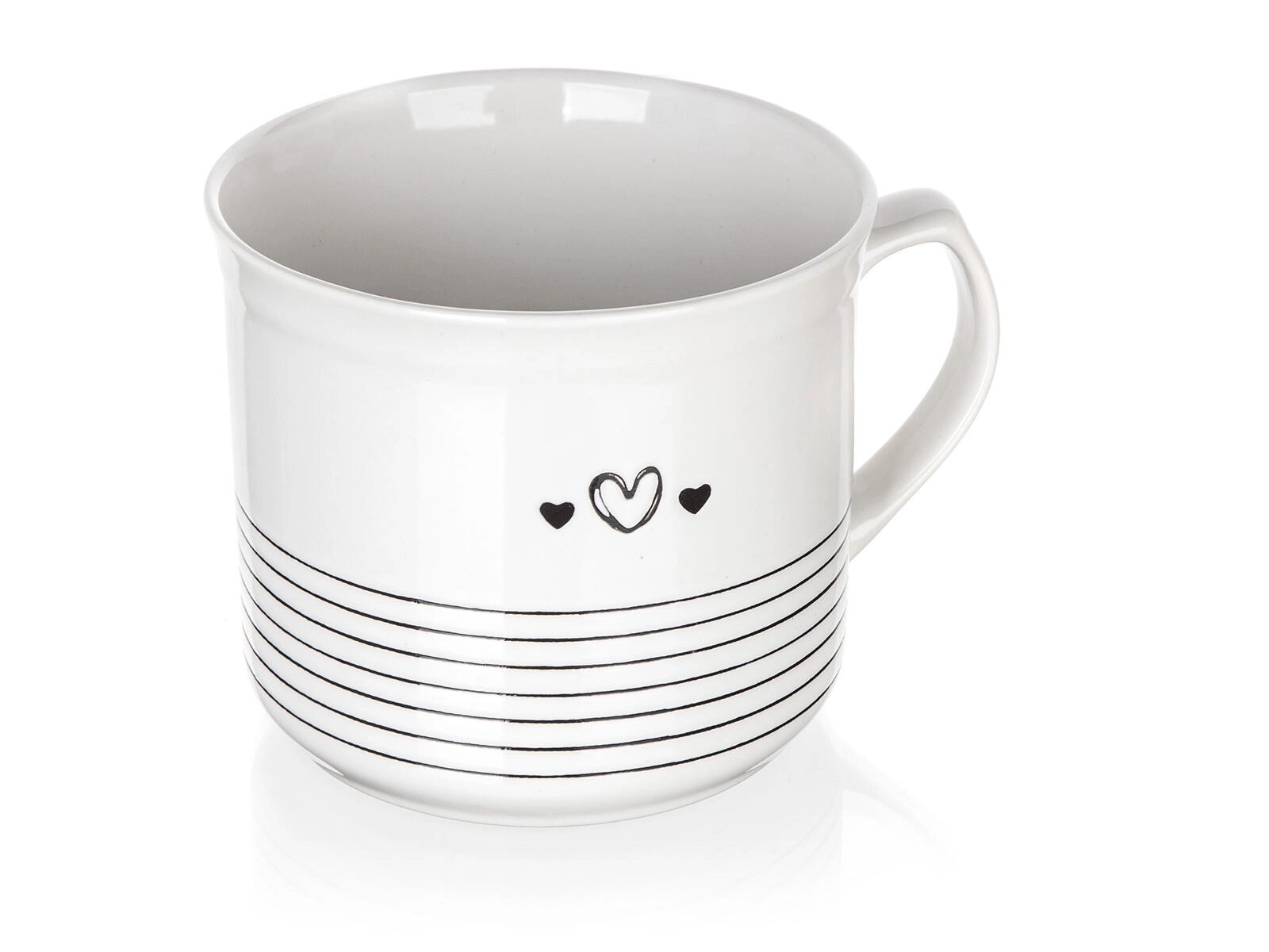 Bucură-te de băuturile tale calde preferate cu stil, cu această cană ceramică mare cu desen în tuș de inimioare. Datorită volumului de 660 ml este perfectă pentru cafeaua lungă de dimineață sau pentru un ceai din plante pe îndelete. Glazura lucioasă și baza albă curată cu detalii negre oferă bucătăriei tale o eleganță atemporală.