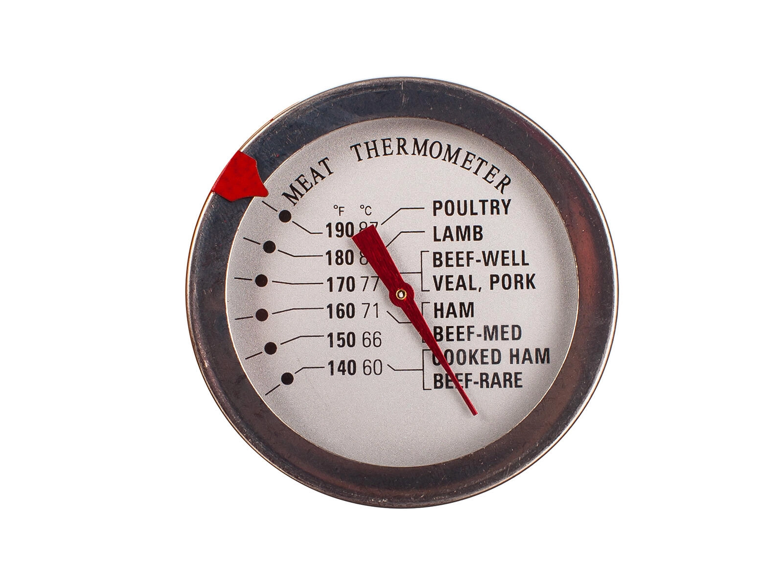 Termometru analogic fiabil pentru carne, cu sondă din inox de 12,5 cm, măsoară precis temperatura internă a cărnii în intervalul 60–87 °C. Cadranul ușor de citit, cu simboluri pentru tipurile de carne, ajută la obținerea unei preparări suculente și sigure atât la cuptor, cât și la fiert.