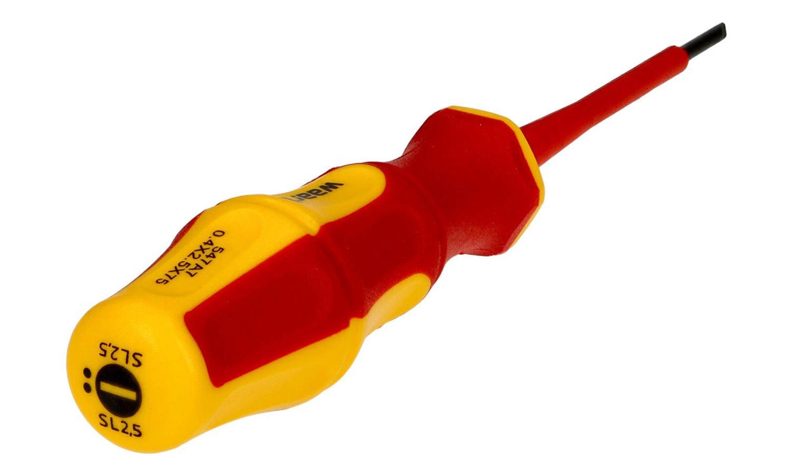 Mânerul ergonomic din TPR/PP combină o prindere antiderapantă sigură cu un control excelent al cuplului. Vârful de tip SL 2,5 este destinat strângerii și desfacerii șuruburilor cu fantă, fiind ideal pentru lucrări electrice fine, cleme și blocuri terminale.