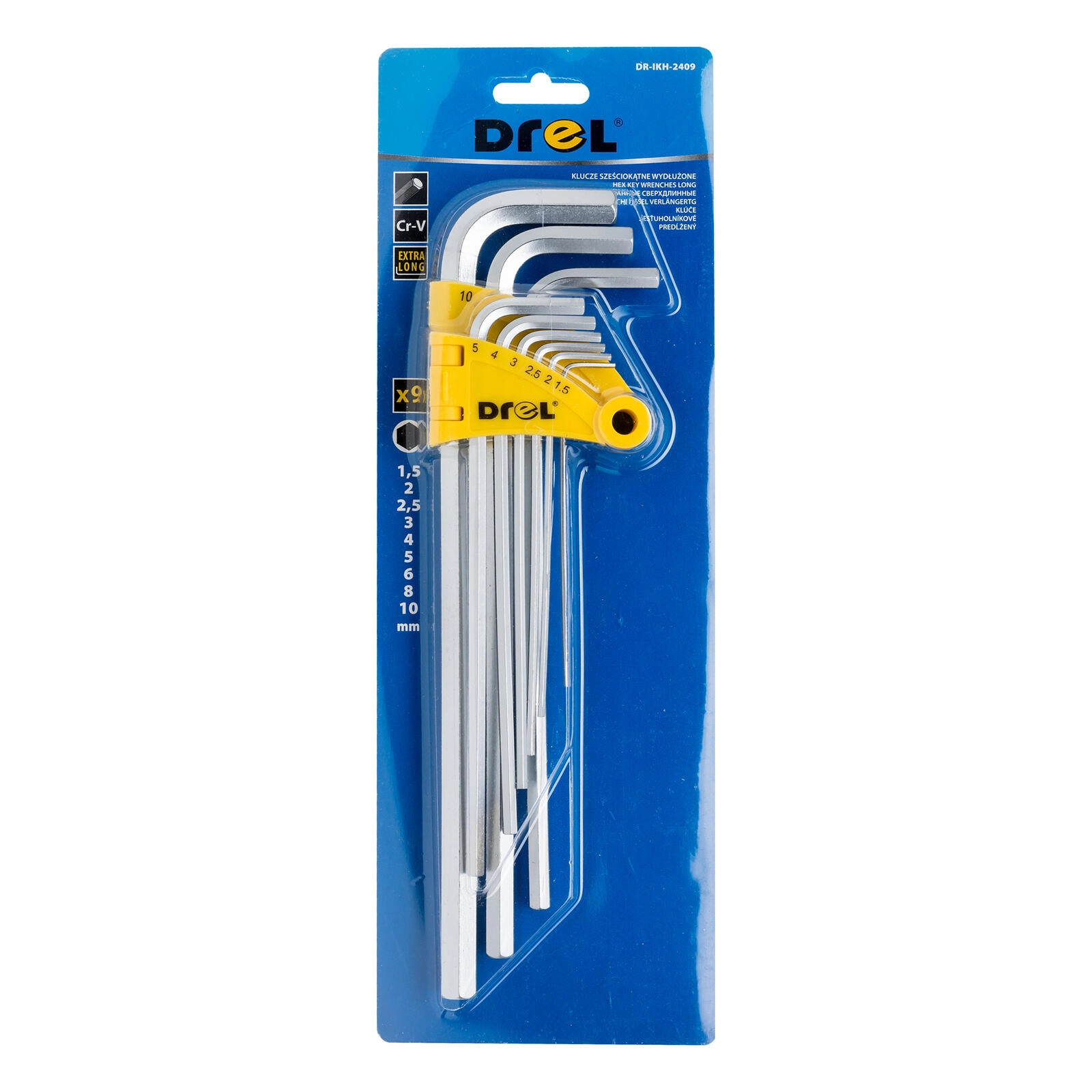 Set practic de chei imbus DREL în variantă lungă, oferă 9 dimensiuni de la 1,5 la 10 mm pentru utilizare universală în atelier și acasă. Datorită materialului din oțel CrV, cheile sunt rezistente și durabile, capătul cu bilă permite deșurubare și strângere confortabilă sub un unghi, iar brațele prelungite asigură acces mai bun și cuplu mai mare.