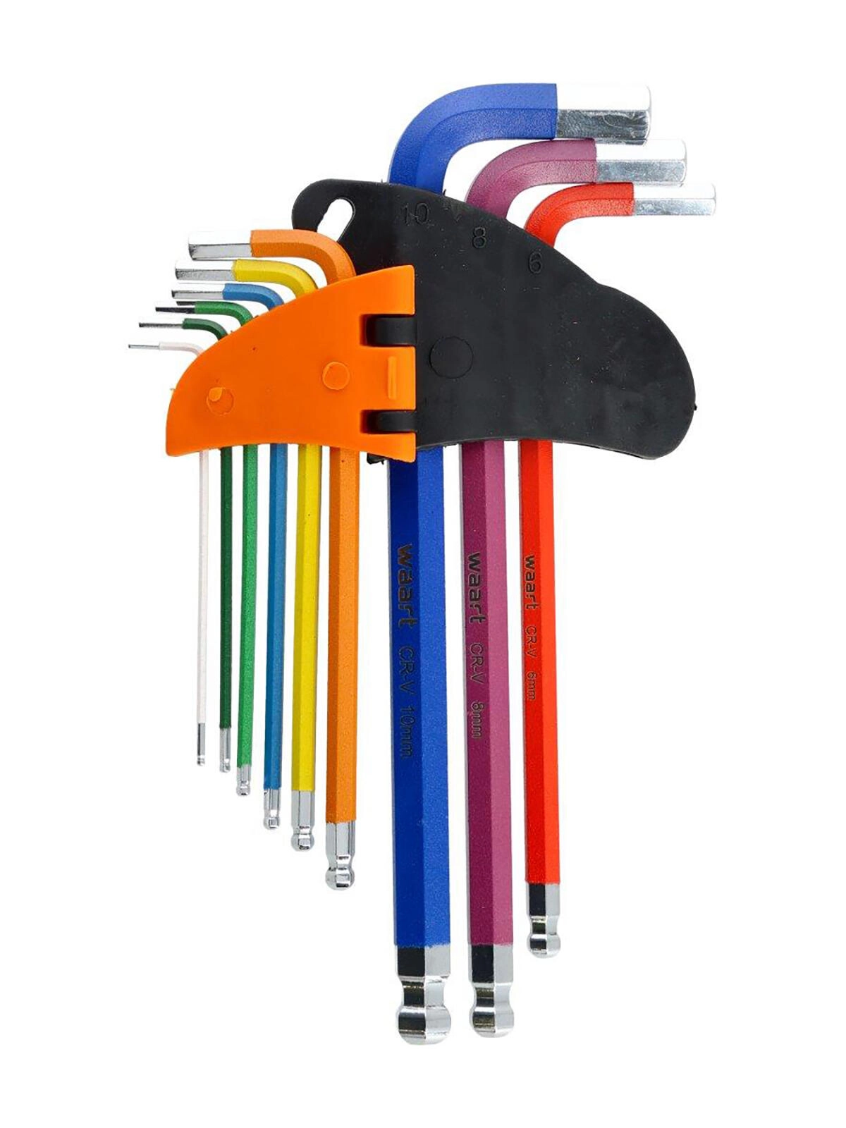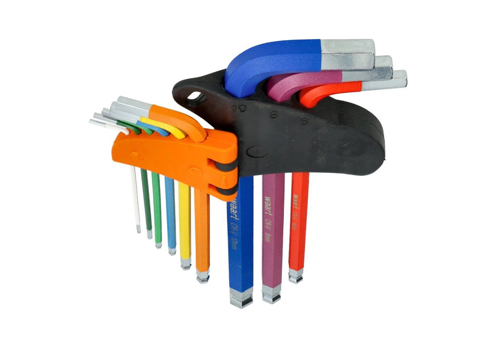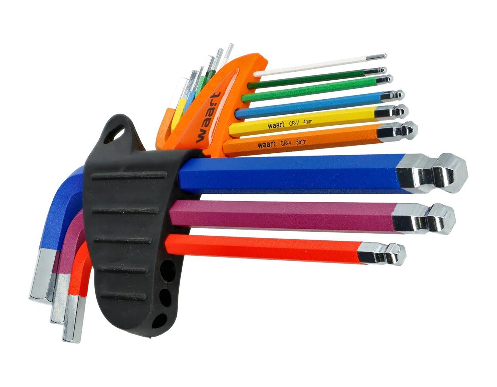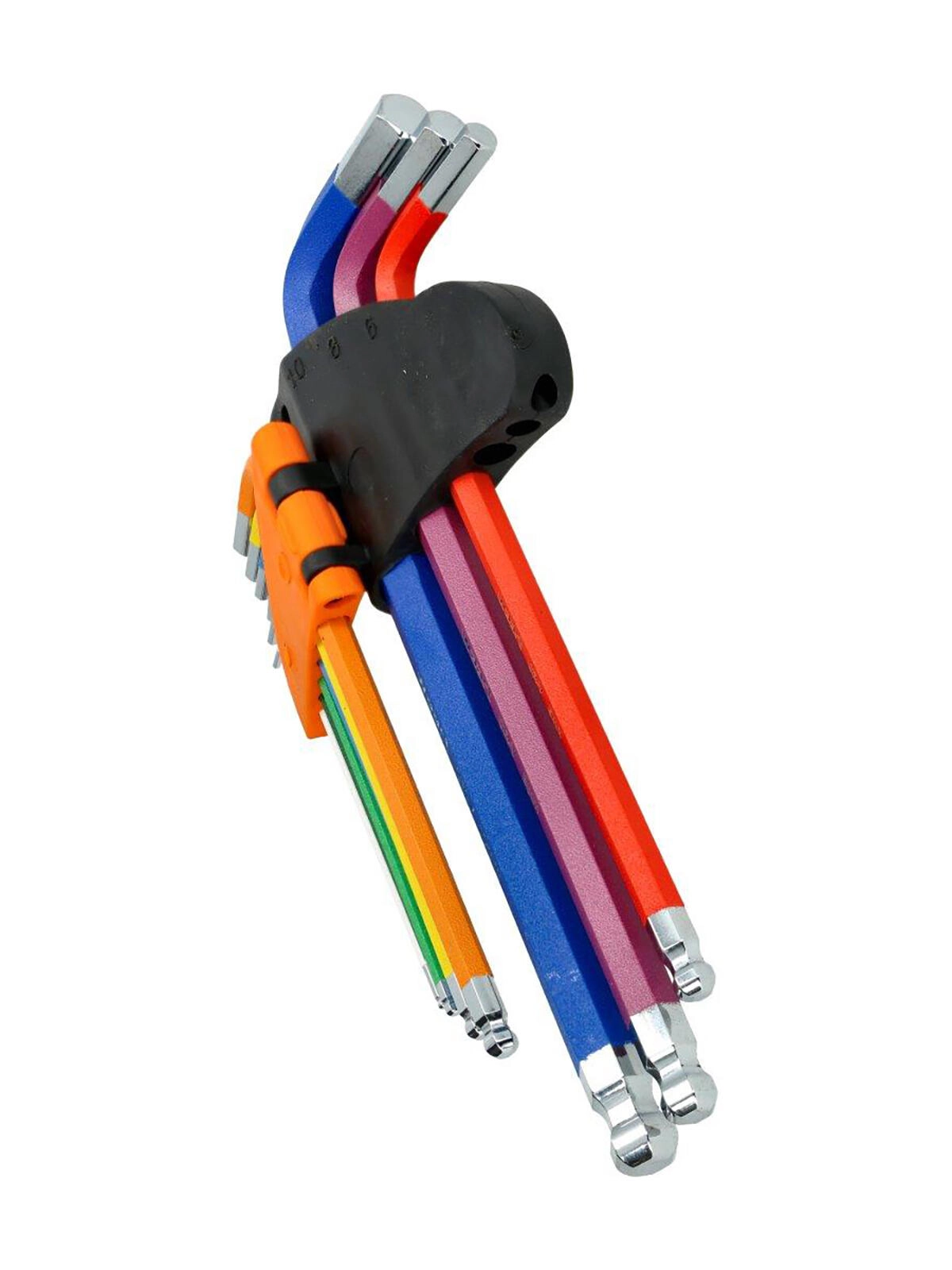 Fiecare cheie este codificată color pentru identificarea imediată a dimensiunii corecte. Profilul sferic (ball-end) permite lucru sub un unghi de până la 25°, astfel poți strânge sau desface cu ușurință șuruburi chiar și acolo unde cheile clasice nu ajung. Brațul lung oferă o pârghie mai mare pentru cuplu sporit și un acces comod la șuruburile adânc încastrate.