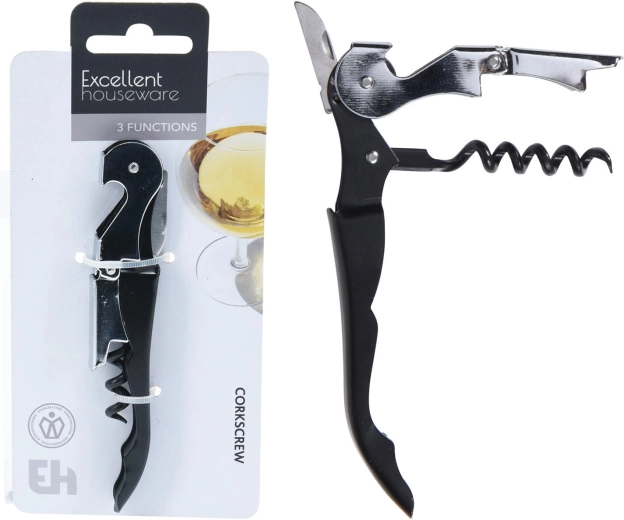 Deschizător practic de ospătar cu 3 funcții, ideal pentru acasă, bar sau picnic. Combină tirbușon, deschizător pentru capace tip coroană și tăietor de folie. Construcția metalică durabilă și dimensiunile compacte asigură o durată lungă de viață și transport comod în buzunar.