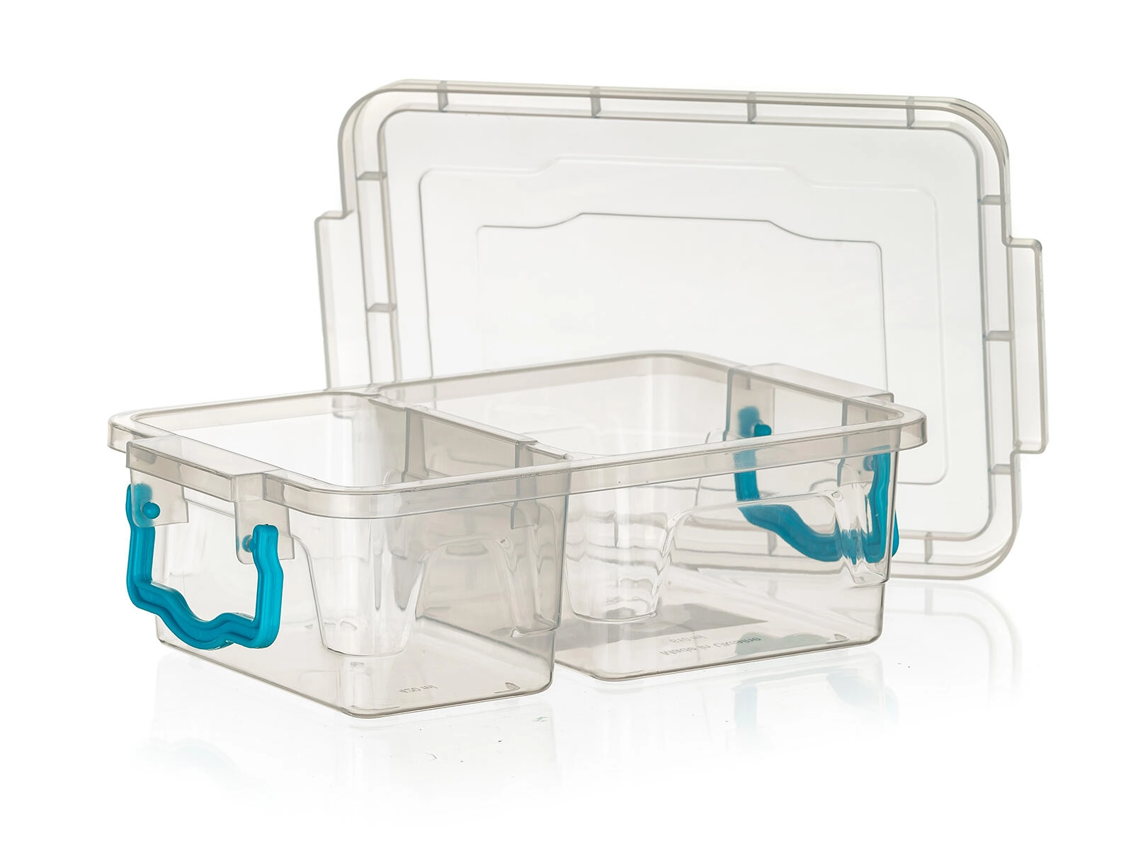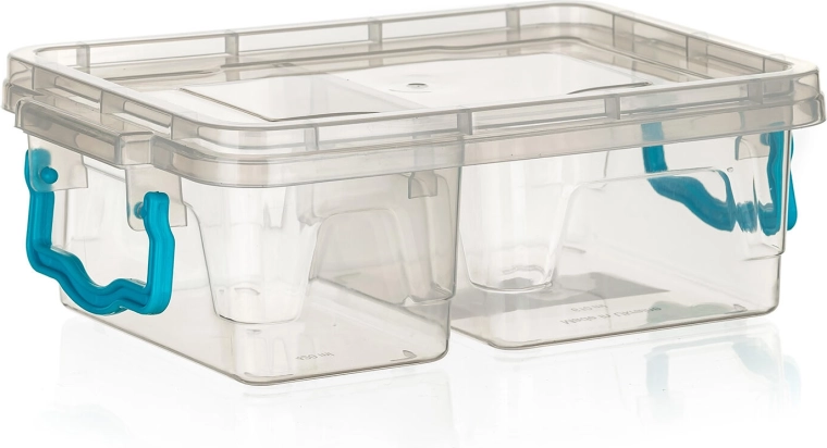 - Cutie transparentă, mânere turcoaz