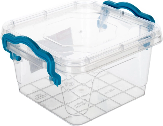 Cutie de bucătărie practică, cu volum de 0,4 l, formă pătrată și corp transparent, completată cu mânere turcoaz pentru transport comod. Potrivită pentru congelator până la −25 °C și cuptor cu microunde până la +95 °C, ideală pentru depozitarea alimentelor și a resturilor de mâncare.