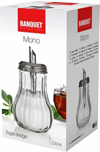 Dozatorul de zahăr MONO este un ajutor elegant și funcțional pentru masă și bar. Sticla transparentă permite monitorizarea constantă a cantității de zahăr, iar capacul din oțel inoxidabil 18/0 cu grosime de 0,40 mm garantează durabilitate îndelungată și întreținere ușoară. Datorită orificiului practic de dozare, turnați comod cantitatea exactă de zahăr în cafea, ceai sau deserturi.