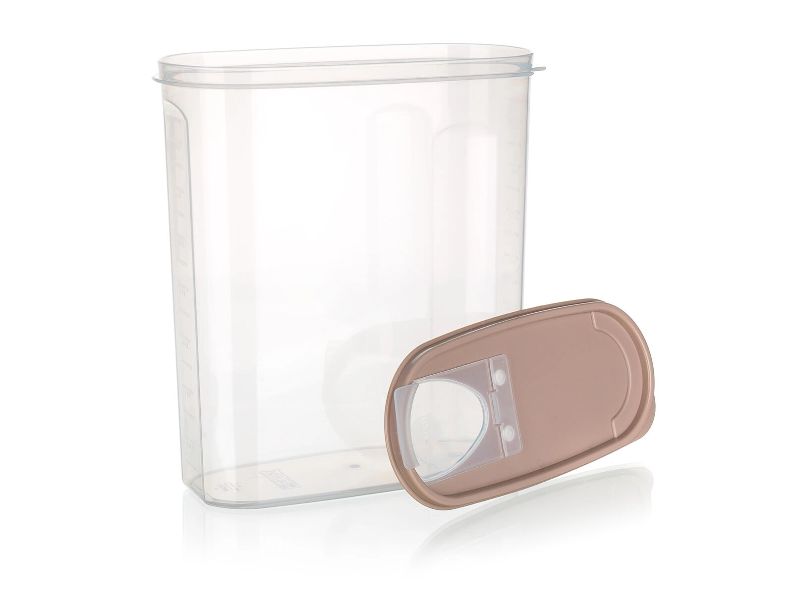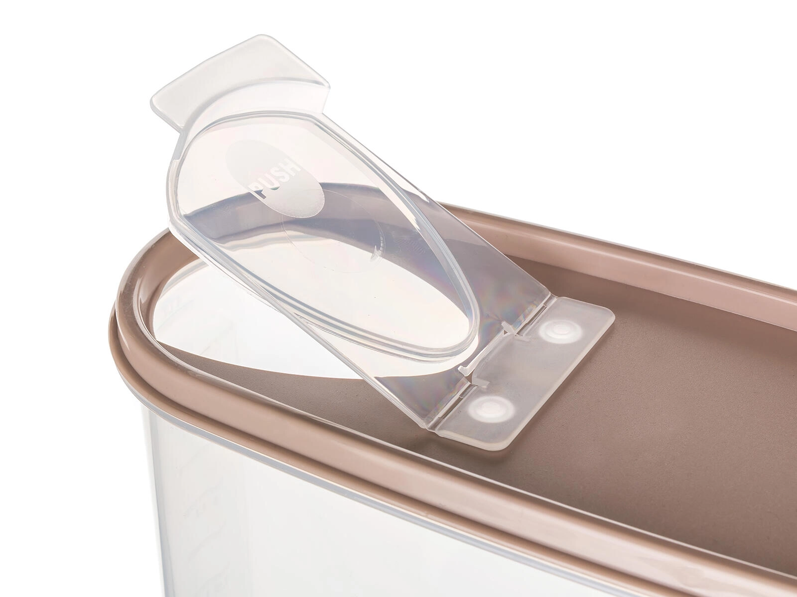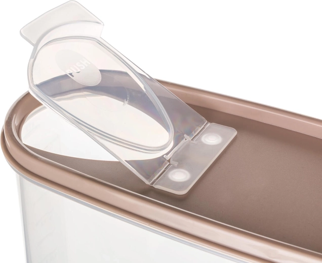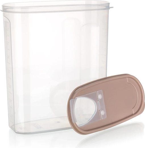 Recipient transparent practic pentru alimente uscate Riva, cu volum de 4 l și capac maro, ideal pentru depozitarea pastelor, orezului, făinii sau leguminoaselor. Datorită corpului transparent aveți mereu o imagine clară asupra conținutului și cantității, în timp ce capacul cu deschidere basculantă permite dozare comodă și asigură prospețime și protecție împotriva umidității. Construcția robustă din plastic este ușoară, rezistentă și ușor de întreținut.