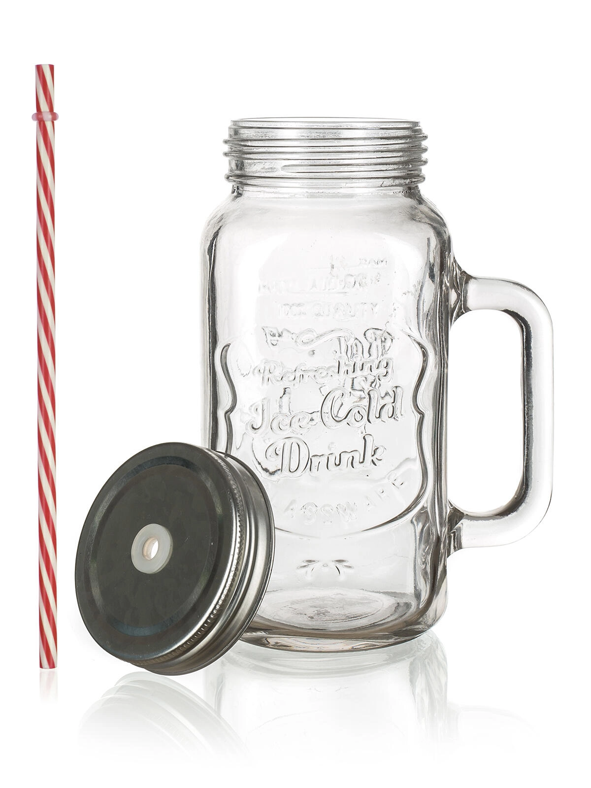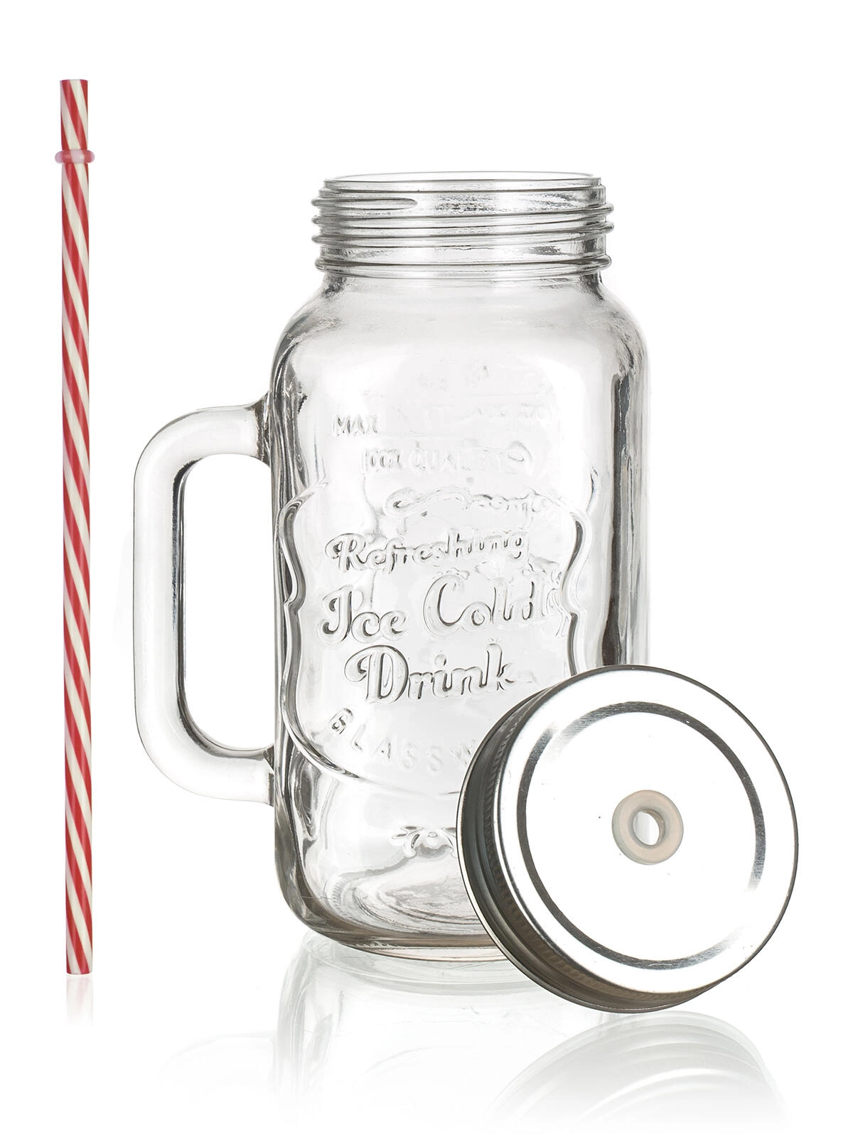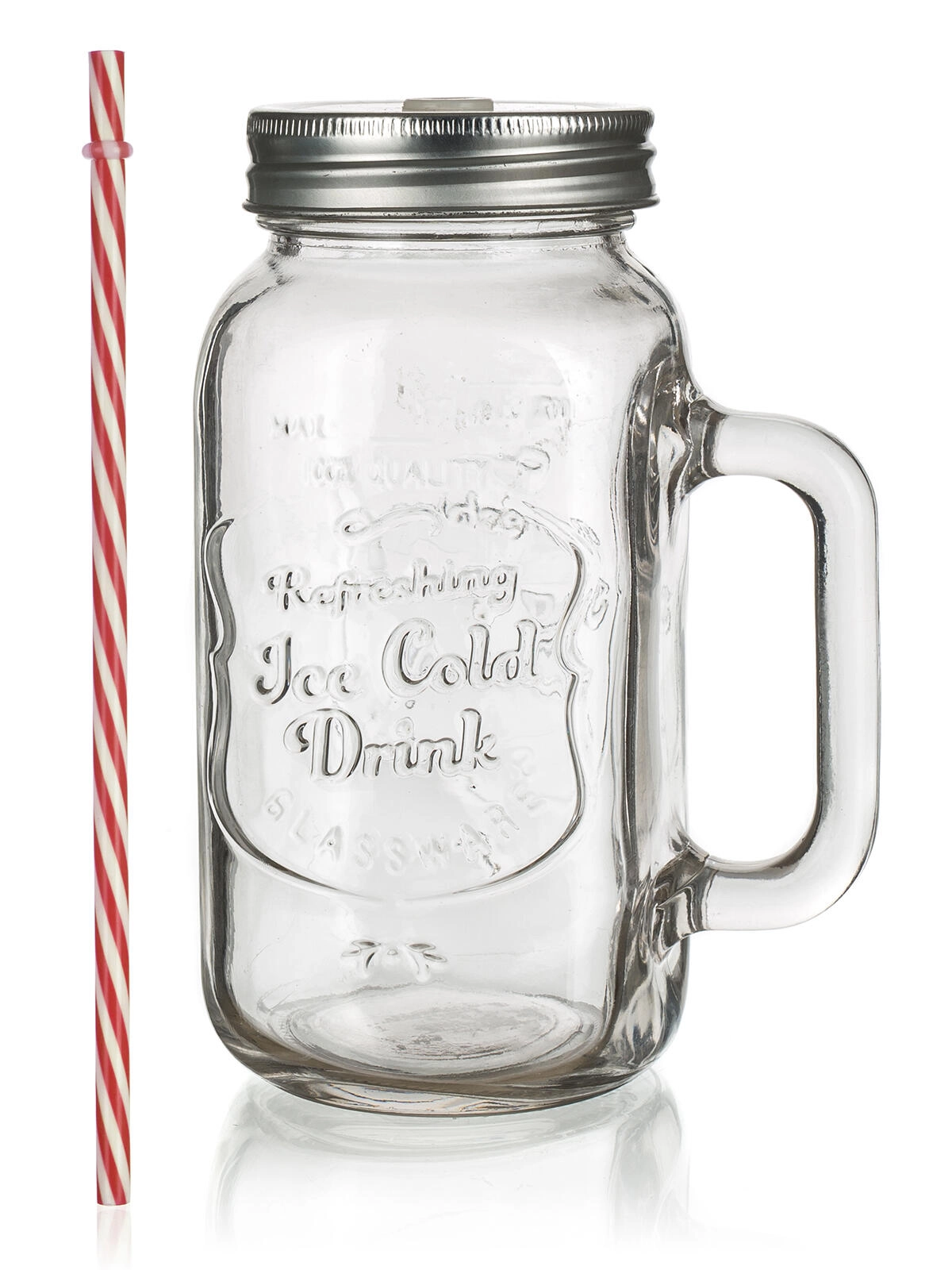 Cană din sticlă elegantă MADEIRA, cu volum de 700 ml, mâner, capac metalic cu șurub și pai reutilizabil, ideală pentru băuturi de vară. Bucură-te de limonadele, ceaiurile cu gheață și cocktailurile tale preferate fără a le vărsa, datorită capacului cu orificiu pentru pai și prinderii confortabile de mâner. Volum mare de 700 ml, capac practic anti-vărsare și design elegant o fac un accesoriu perfect pentru petreceri în grădină, party-uri de vară și nunți.