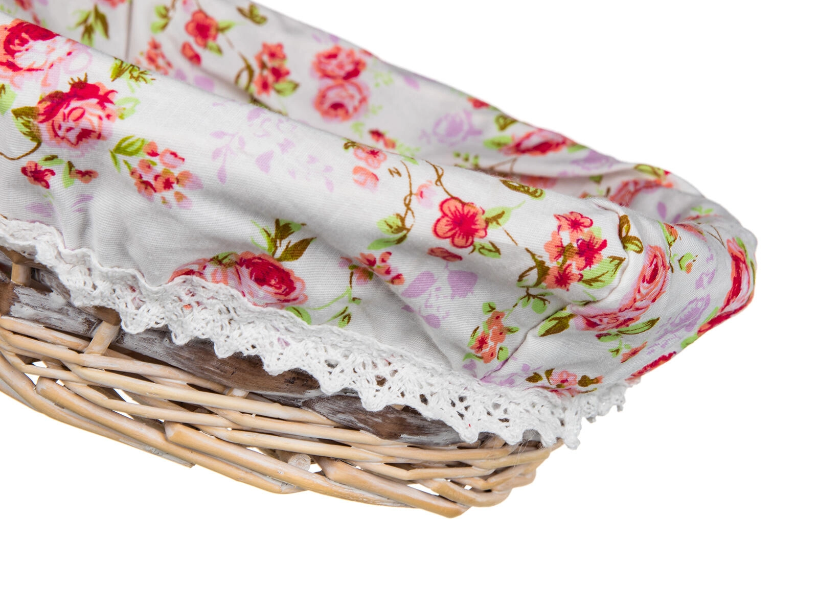 Coș rotund fermecător din nuiele, cu căptușeală din bumbac detașabilă, albă, cu model floral roz și tiv delicat din dantelă. Se potrivește de minune în interioare romantice, rustice sau scandinave și se asortează ușor cu alte accesorii din locuință.