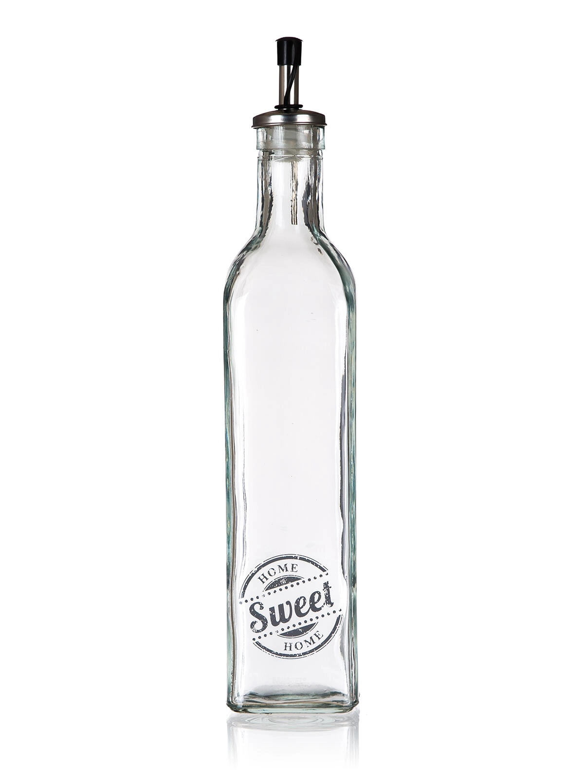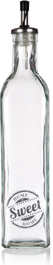 Sticlă de ulei din sticlă, stilată, cu decor SWEET HOME, cu un volum de 500 ml, este un accesoriu practic pentru orice bucătărie. Are formă pătrată pentru stabilitate și prindere confortabilă, este echipată cu picurător metalic cu capac din plastic și garnitură pentru dozare curată și precisă, fără picurare.
