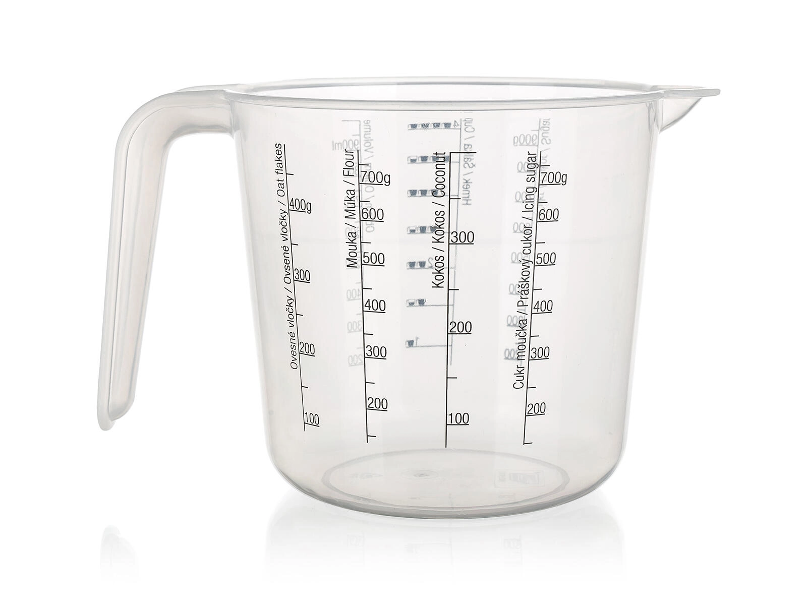 Cană gradată practică din plastic, cu volum de 1 l, care facilitează gătitul și coptul precise datorită scalelor clare pentru ingrediente solide și lichide. Oferă scale de măsurare pentru nucă de cocos, fulgi de ovăz, făină, zahăr pudră, zahăr și volum în ml sau în cupe, astfel ai totul la îndemână într-un singur vas.
