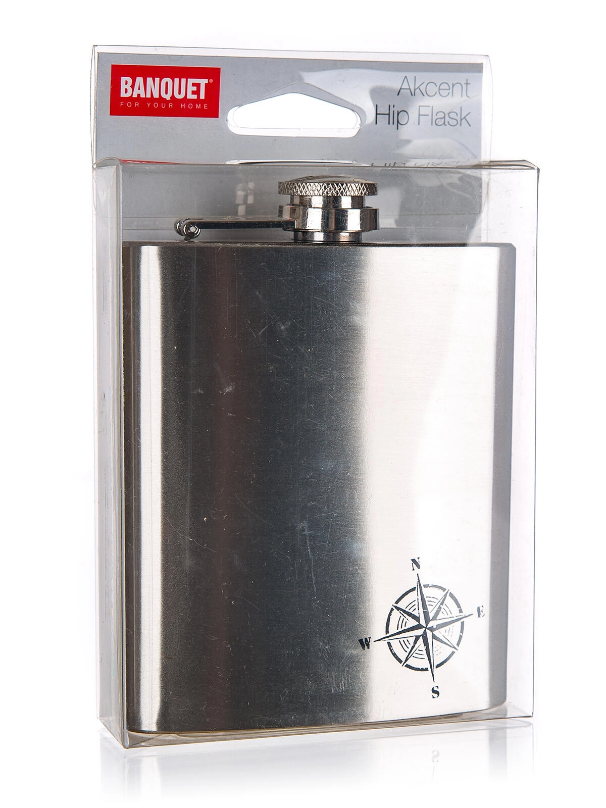 Ploscă din inox Akcent, stilată, cu motiv North și volum de 200 ml, ideală pentru călătorii și ca cadou. Datorită dimensiunilor sale compacte, încape ușor în buzunar, iar oțelul inoxidabil rezistent asigură durabilitate îndelungată și utilizare igienică pentru sucuri și băuturi alcoolice.