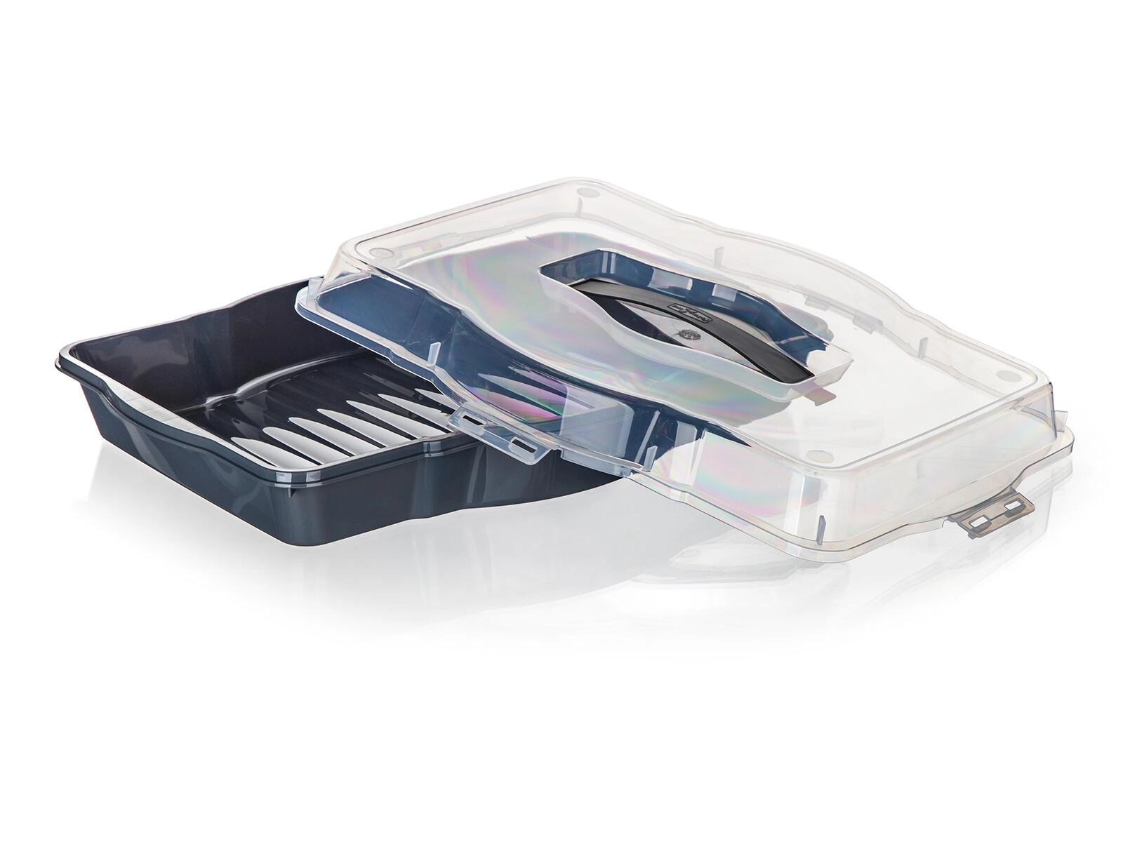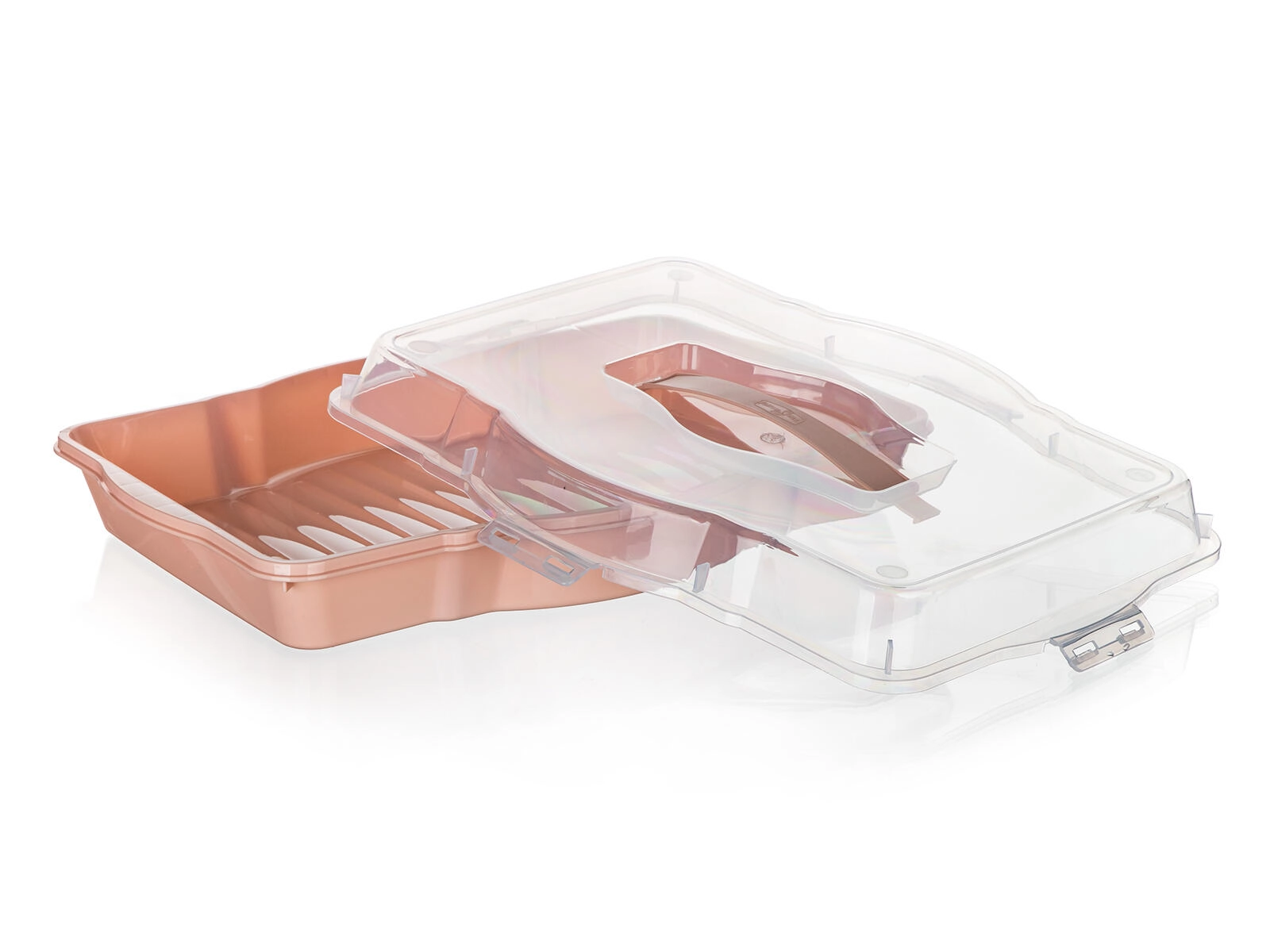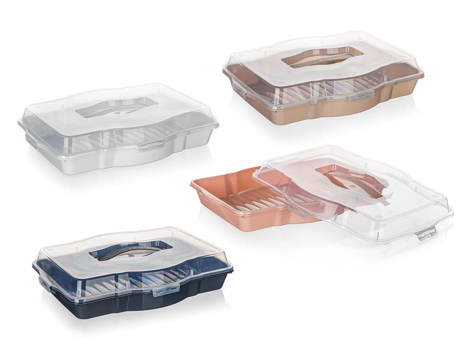 Tavă practică din plastic cu capac CULINARIA, cu dimensiunile 44,5 × 34 cm, ideală pentru transportul și depozitarea torturilor, tartelor și altor bunătăți. Datorită închiderii ferme, conținutul rămâne protejat de praf și uscare, iar tava este, în plus, compatibilă cu mașina de spălat vase pentru o întreținere ușoară. Disponibilă într-un mix de culori.