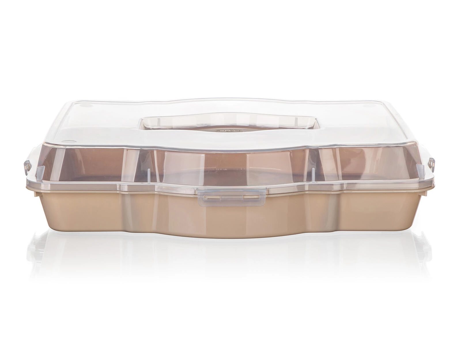 Execuția din plastic rezistent este ușoară, ușor de întreținut și poate fi spălată fără griji în mașina de spălat vase. Capacul cu cleme stă fix, astfel încât deserturile rămân proaspete și neatinse chiar și pe drum.