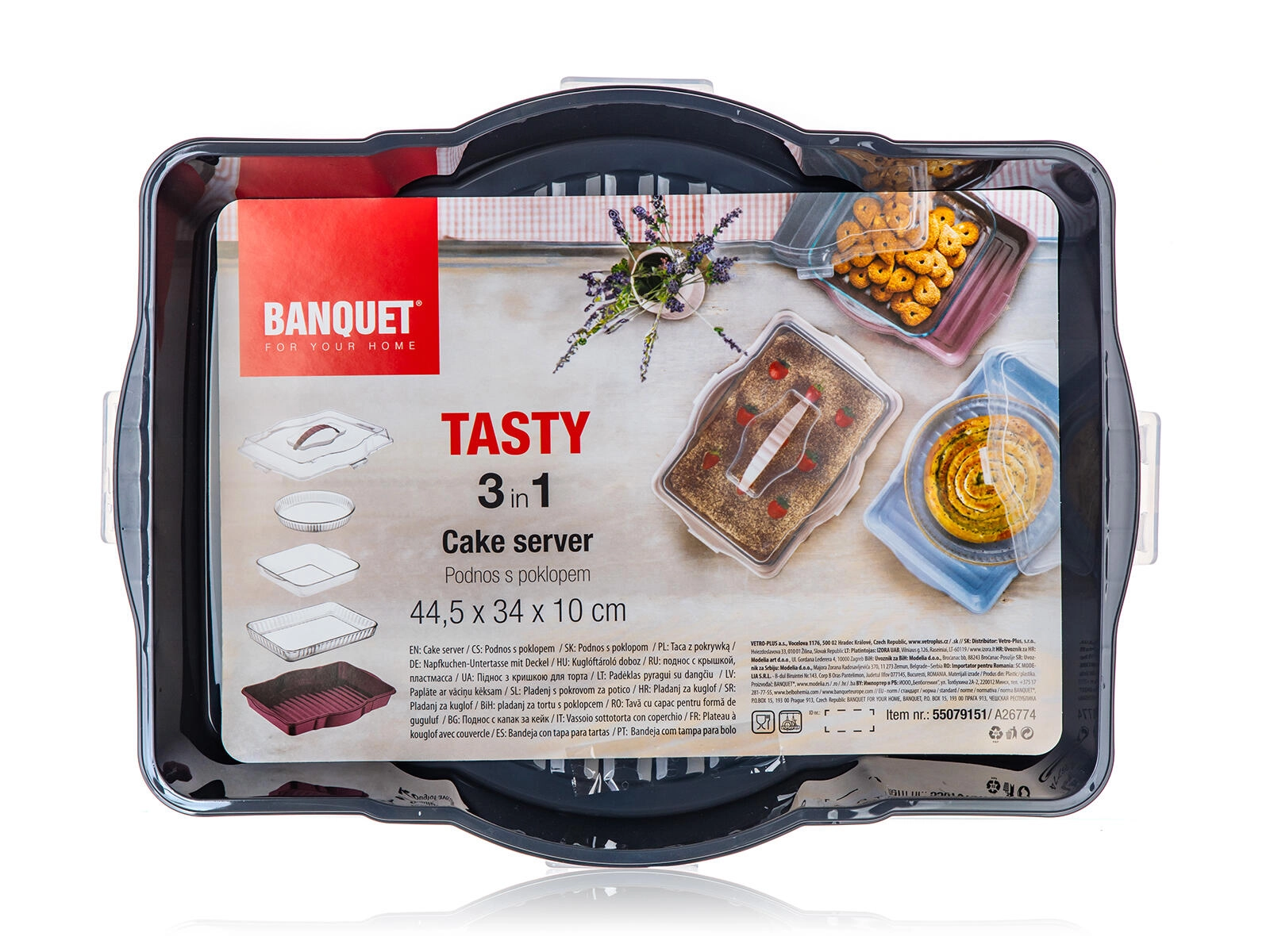 - Dimensiuni generoase 44,5 × 34 cm pentru torturi, prăjituri și sandvișuri
