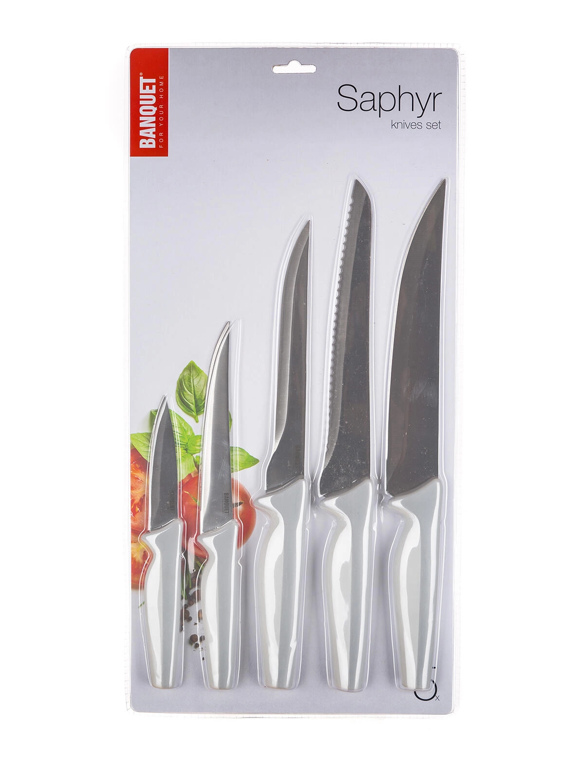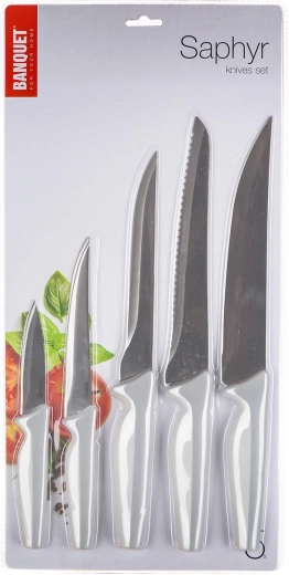 Setul practic de cuțite de bucătărie SAPHYR conține cele cinci tipuri de cuțite cel mai des folosite pentru gătitul de zi cu zi. Datorită oțelului de calitate și mânerelor ergonomice gri, oferă tăiere precisă, durată lungă de viață a tăișului și manipulare confortabilă la prepararea tuturor tipurilor de alimente.