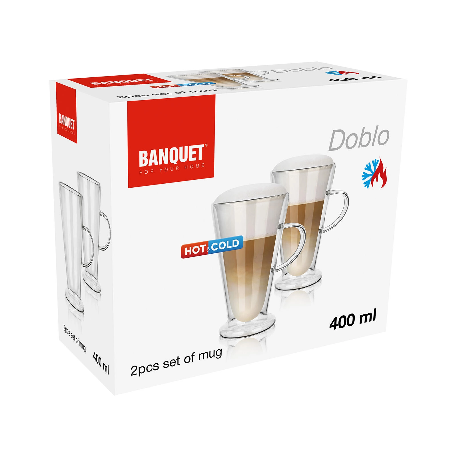 Elegantele căni DOBLO cu perete dublu și volum de 400 ml sunt ideale pentru iubitorii de cafea și ceai. Datorită sticlei duble cu izolație termică, băutura rămâne mai mult timp fierbinte sau rece, în timp ce peretele exterior rămâne plăcut rece la atingere. Volumul generos de 400 ml, mânerul confortabil și posibilitatea de spălare în mașina de spălat vase le fac o alegere perfectă pentru utilizarea zilnică.