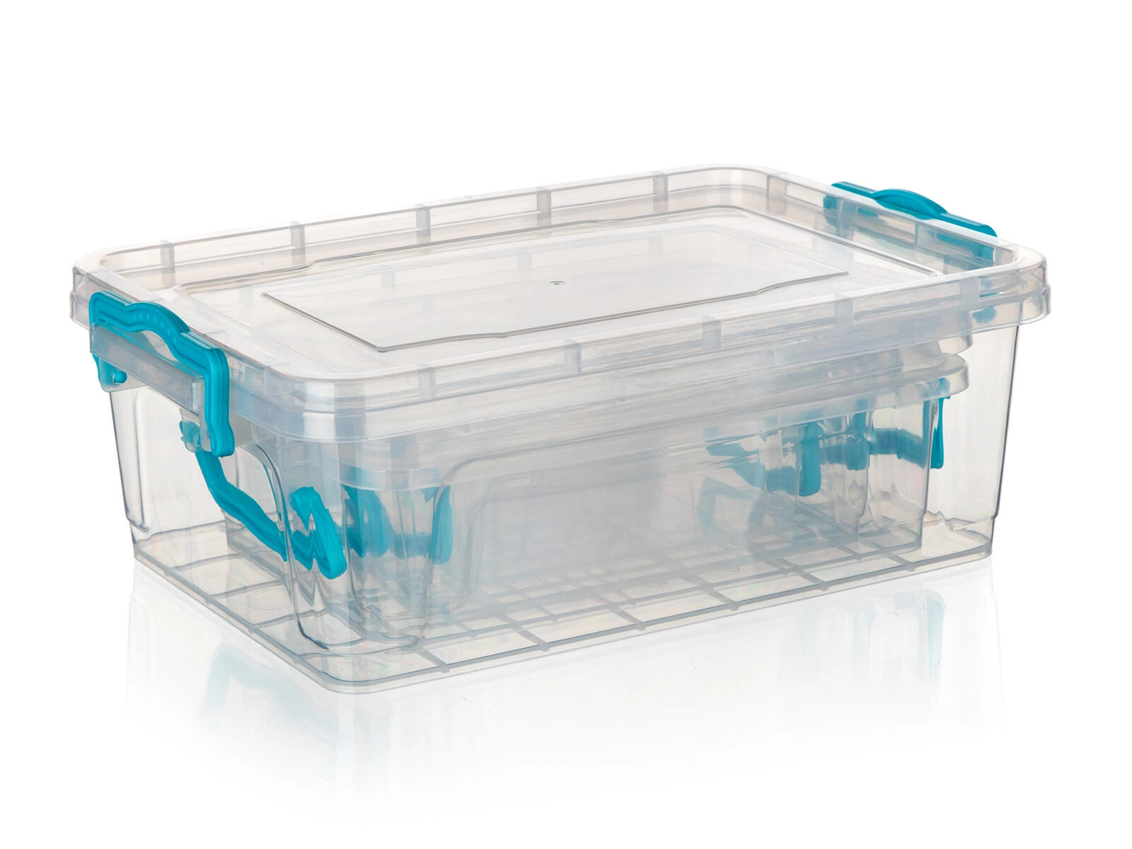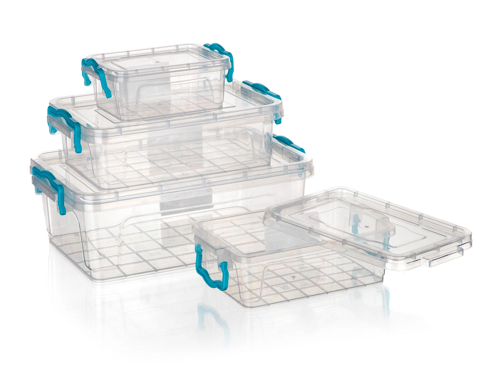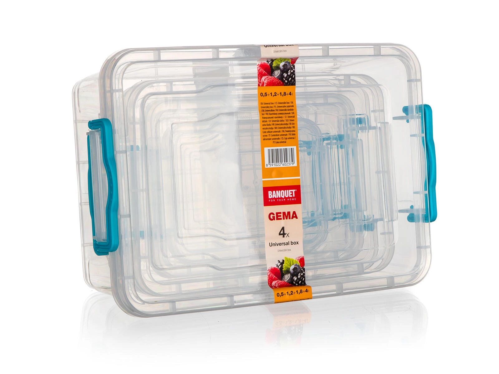 Setul GEMA include patru cutii universale din plastic, cu volume de 0,5 l, 1,2 l, 1,8 l și 4 l. Datorită pereților transparenți vedeți rapid conținutul, iar mânerele turcoaz cu clips mențin capacul bine închis la depozitare și la transport.