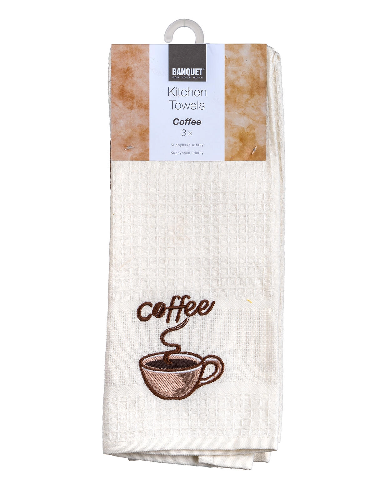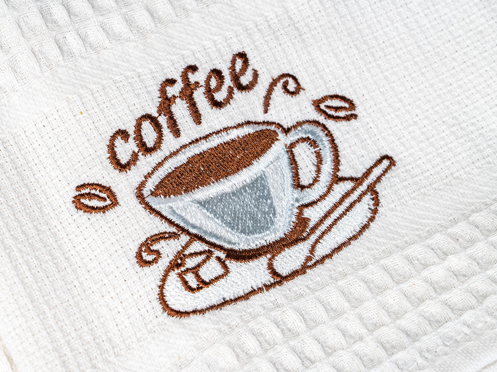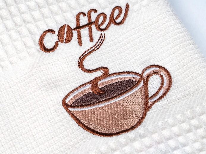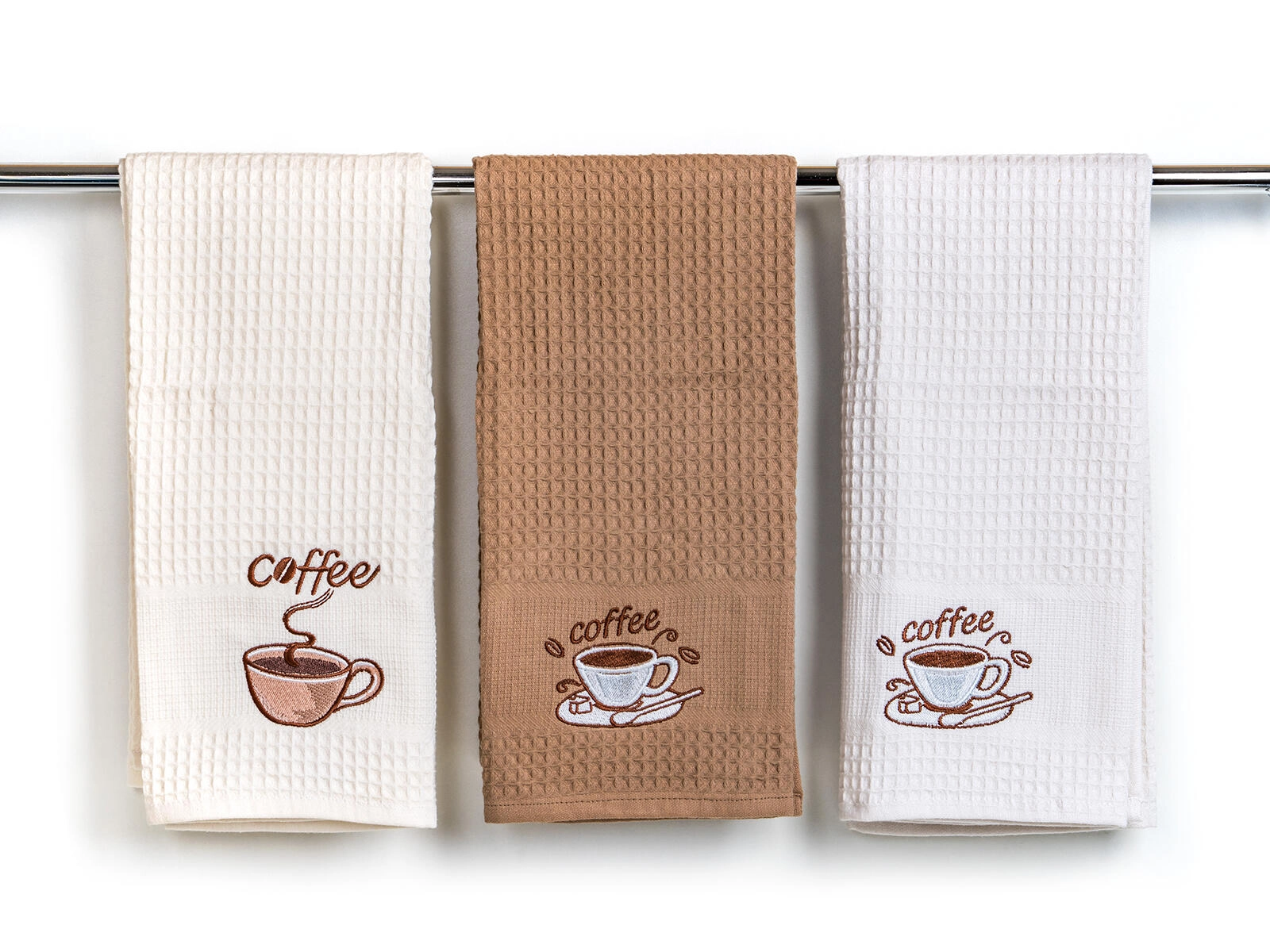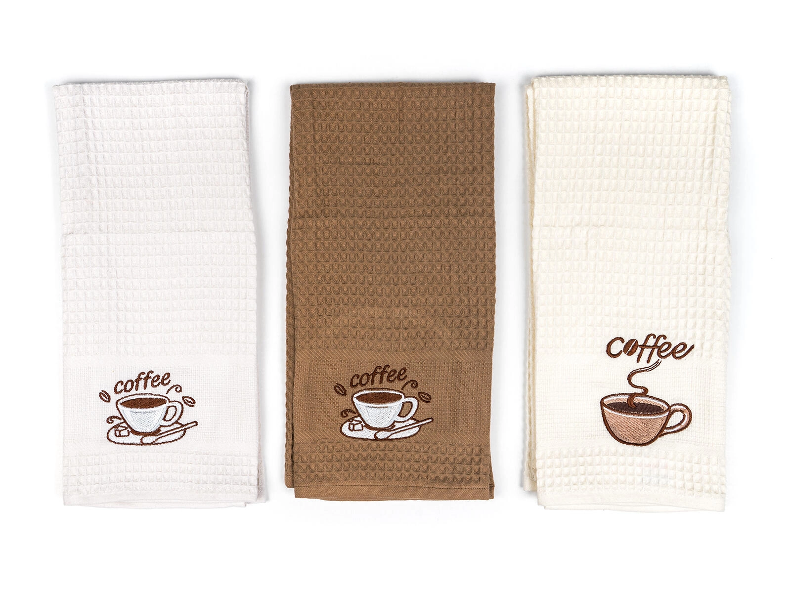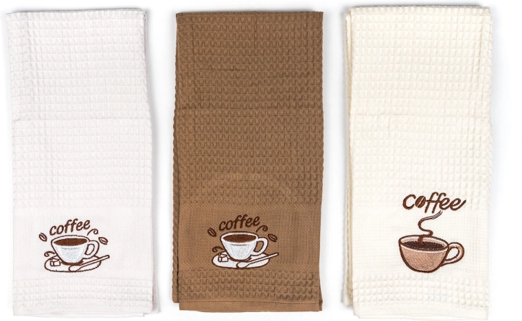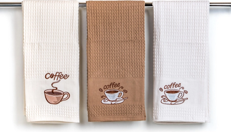 Broderia decorativă coffee adaugă un plus de stil bucătăriei. Setul de trei piese în nuanțe de alb, crem și bej se potrivește oricărui interior.