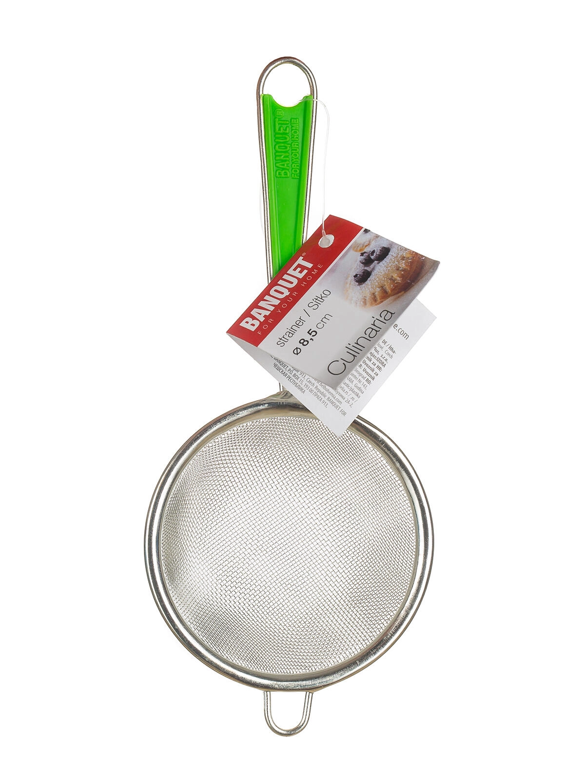Strecurătoare de bucătărie practică CULINARIA cu diametrul de 8,5 cm pentru strecurarea zilnică a lichidelor și băuturilor. Datorită ochiurilor fine ale plasei 1 × 1 mm reține chiar și impuritățile mărunte, metalul cositorit asigură rezistență, iar inserția din plastic ABS din mâner oferă o prindere confortabilă și sigură. Designul stilat verde se potrivește oricărei bucătării.