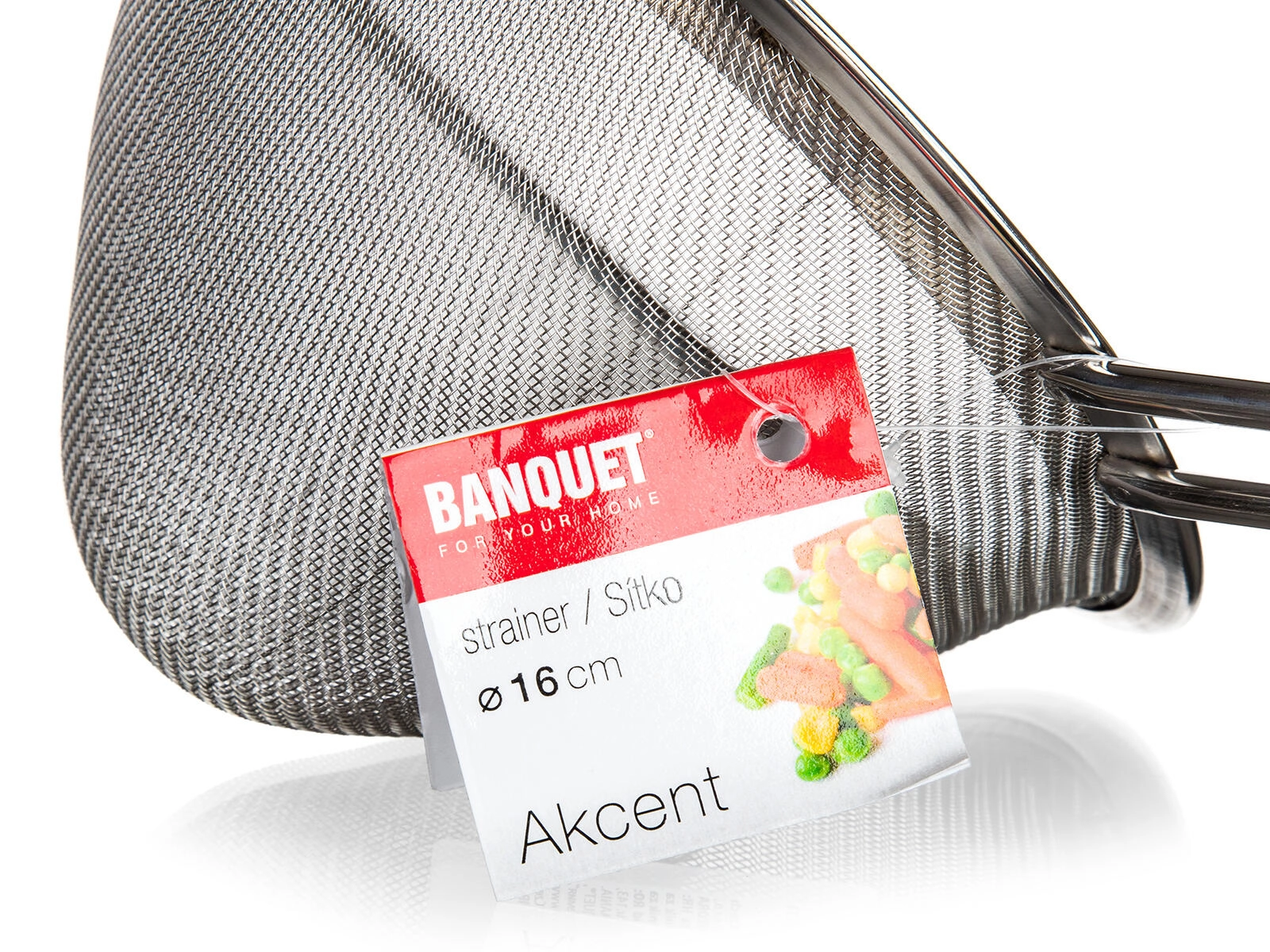 Strecurătoarea conică din inox AKCENT cu diametrul de 16 cm este ideală pentru strecurarea lichidelor, cernerea făinii și filtrarea fină a sosurilor. Datorită plasei fine din sârmă reține chiar și impuritățile mărunte, iar mânerul ușor cu agățătoare permite utilizare confortabilă și agățare facilă.