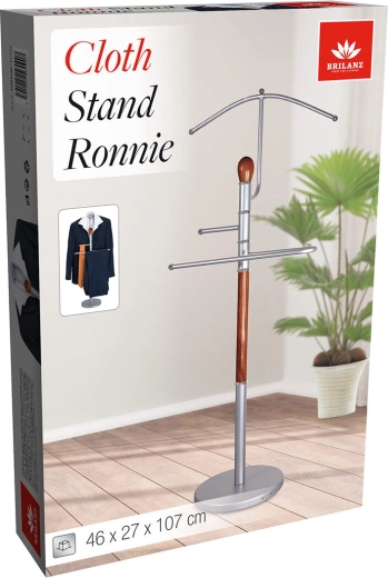 Elegantul valet mut RONNIE combină crom mat și lemn natural în nuanță mediu-maro pentru o depozitare stilată și practică a hainelor. Datorită bazei stabile și înălțimii de 107 cm, păstrează cămăși, sacouri și pantaloni mereu la îndemână și bine organizate.
