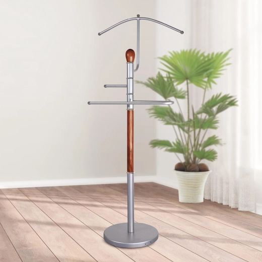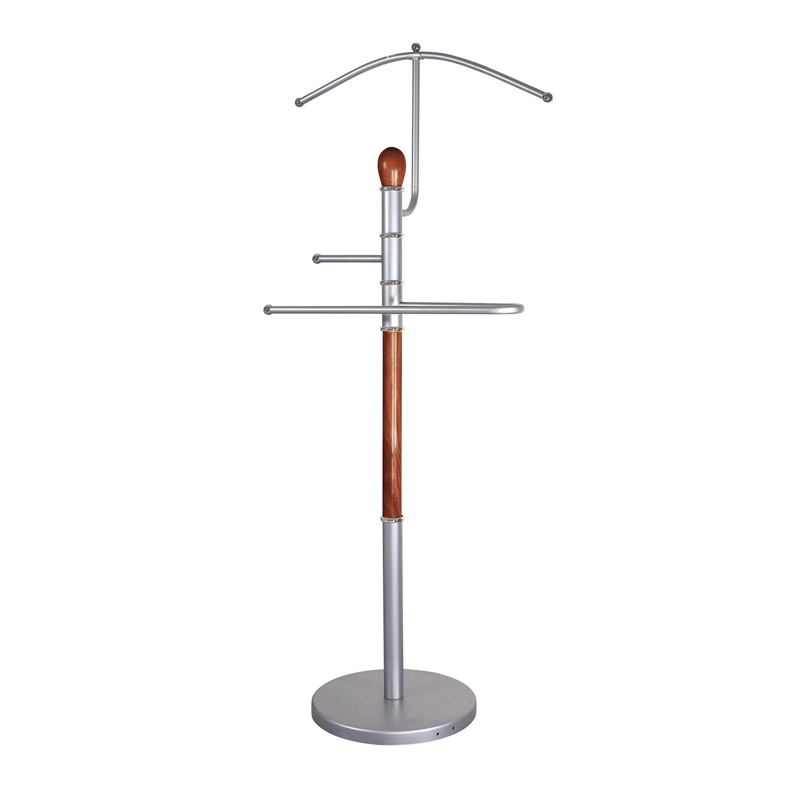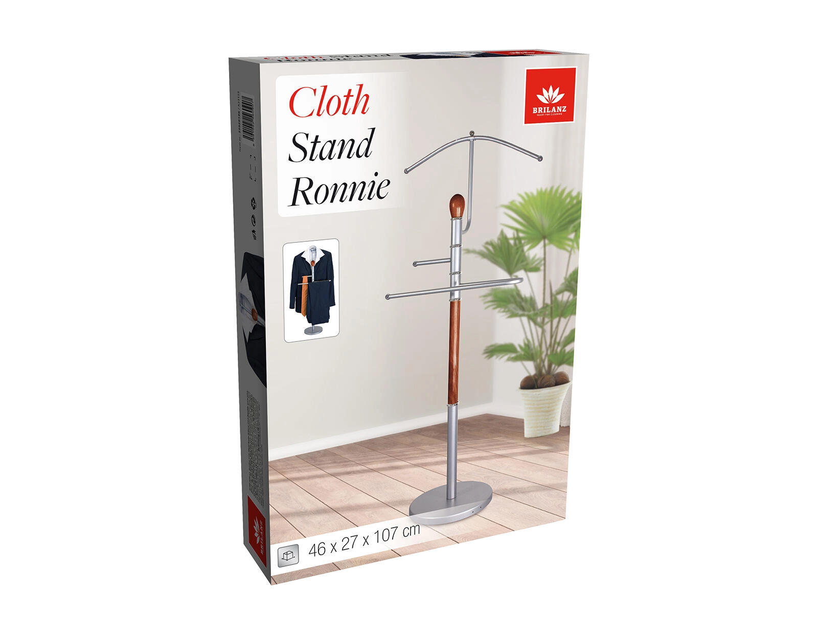 Valetul mut RONNIE este accesoriul ideal pentru dormitor, dressing sau hol. Se remarcă prin combinația de crom mat și lemn de calitate în nuanță maro, care oferă interiorului un aspect modern și atemporal. Construcția practică permite așezarea diferitelor piese vestimentare, astfel încât să rămână fără șifonare și mereu gata de purtat.