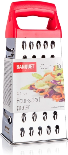 Răzătoare practică cu patru fețe, în formă de A, pentru răzuire rapidă și precisă. Datorită otelului inoxidabil, construcției stabile și mânerului confortabil din plastic în culoarea bordeaux, oferă durată lungă de viață, utilizare sigură și întreținere ușoară.