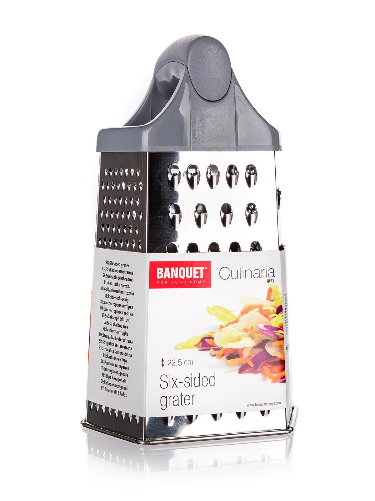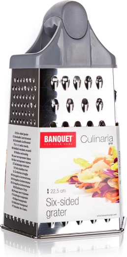 Descoperiți ajutorul universal din bucătărie – răzătoarea din inox cu șase fețe CULINARIA Grey, înălțime 22,5 cm. Oferă diferite tipuri de lame pentru răzuire fină și grosieră, tăiere și feliere, fiind potrivită pentru brânză, legume, fructe și ciocolată. Datorită construcției robuste, este stabilă în utilizare și ușor de întreținut.